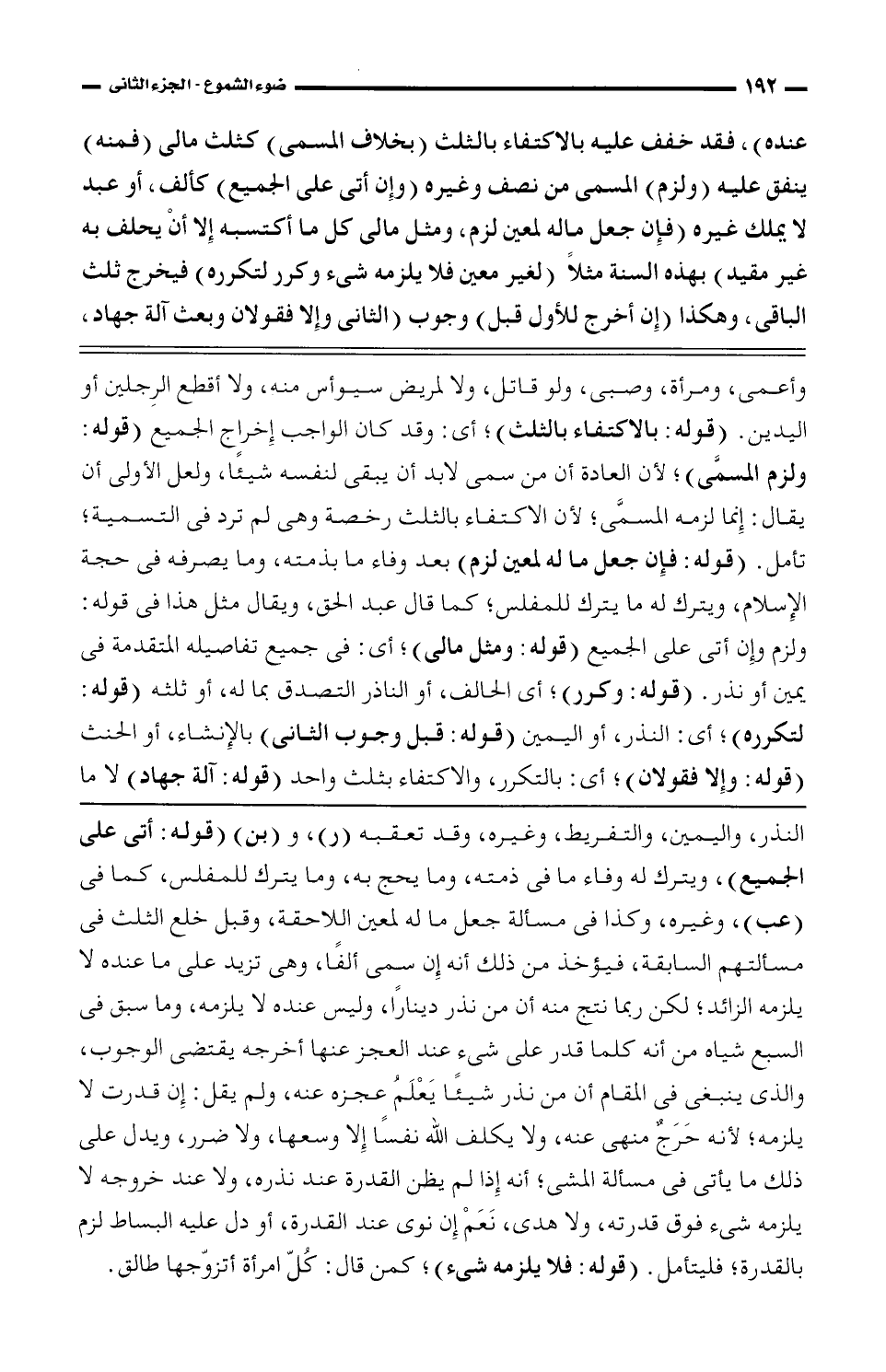 النذر، واليمين، والتفريط، وغيره، وقد تعقبه (ر)، و (بن) (قوله: أتى على الجميع)، ويترك له وفاء ما في ذمته، وما يحج به، وما يترك للمفلس، كما في (عب)، وغيره، وكذا في مسألة جعل ما له لمعين اللاحقة، وقبل خلع الثلث في مسألتهم السابقة، فيؤخذ من ذلك أنه سمى ألفًا، وهي تزيد على ما عند لا يلزمه الزائد؛ لكن ربما نتج منه أن من نذر دينارًا، وليس عنده لا يلزمه، وما سبق في السبع شياه من أنه كلما قدر على شيء عند العجز عنها أخرجه يقتضي الوجوب، والذي ينبغي في المقام أن من نذر شيئًا يعلم عجزه عنه، ولم يقل: إن قدرت لا يلزمه؛ لأنه حرج منهي عنه، ولا يكلف الله نفسًا إلا وسعها، ولا ضرر، ويدل على ذلك ما يأتي في مسألة المشي؛ أنه إذا لم يظن القدرة عند نذره، ولا عند خروجه لا يلزمه شيء فوق قدرته، ولا هدي، نعم إن نوى عند القدرة، أو دل عليه البساط لزم بالقدرة؛ فليتأمل. (قوله: فلا يلزمه شيء)؛ كمن قال: كل امرأة أتزوجها طالق.
