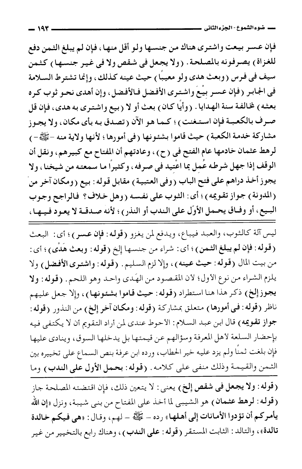 فإن عسر بيعت واشترى هناك من جنسها ولو أقل منها، فإن لم يبلغ الثمن دفع للغزاة) يصرفونه بالمصلحة. (ولا يجعل في شقص ولا في غير جنسها) كثمن سيف في فرس (وبعث هدى ولو معيبًا) حيث عينه كذلك، وإنما تشترط السلامة في الجابر (فإن عسر بيع واشترى الأفضل فالأفضل، وإن أهدى نحو ثوب كره بعثه) لمخالفة سنة الهدايا. (وأيا كان) بعث أو لا (بيع وشاترى به هدى، فإن قل صرف بالكعبة فإن استغنت)؛ كما هو الآن (تصدق به بأن مكان، ولا يجوز مشاركة خدمة الكعبة) حيث قامون بشئونها (في أمورها؛ لأنها ولاية منه- صلى الله عليه وسلم-) لرهط عثمان خادمها عام الفتح في (ح)، وعادتهم أن المفتاح مع كبيرهم، ونقل أن الوقف إذا جهل شرطه عمل بما اعتيد في صرفه، وكثيرًا ما سمعته من شيخنا، ولا يجوز أخذ دراهم على فتح الباب (وفي العتبية) مقابل قوله: بيع (ومكان آخر من (المدونة) جواز تقويمه)؛ أي: الثوب على نفسه (وهل خلاف؟ فالراجح وجوب البيع، أو وفاق يحمل الأول على الندب أو النذر)؛ لأنه صدقة لا يعود فيها،