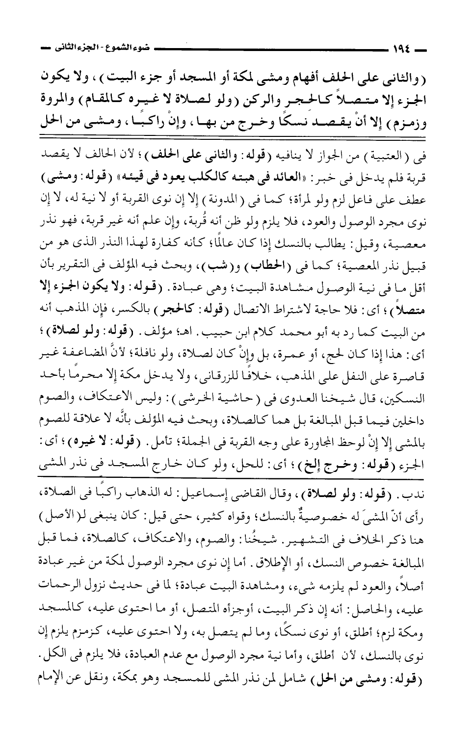 في (العتبية) من الجواز لا ينافيه (قوله: والثاني على الحلف)؛ لأن الحالف لا يقصد قربة فلم يدخل في خبر: "العائد في هبته كالكلب يعود في قيئه" قوله: ومشى) عطف على فاعل لزم ولو لمرأة؛ كما في (المدونة) إلا إن نوى القربة أو لا نية له، لا إن نوى مجرد الوصول والعود، فلا يلزم ولو ظن أنه قربة، وإن علم أنه غير قربة، فهو نذر معصية، وقيل: يطالب بالنسك إذا كان عالمًا؛ كأنه كفارة لهذا النذر الذي هو من قبيل نذر المعصية؛ كما في (الحطاب) و (شب)، وبحث فيه المؤلف في التقرير بأن أقل ما في نية الوصول مشاهدة البيت؛ وهي عبادة. (قوله: ولا يكون الجزء إلا متصلًا)؛ أي: فلا حاجة لاشتراط الاتصال (قوله: كالحجر) بالكسر، فإن المذهب أنه من البيت كما رد به أبو محمد كلام ابن حبيب. اهـ؛ مؤلف. (قوله: ولو لصلاة)؛ أي: هذا إذا كان لحج، أو عمرة، بل وإن كان لصلاة، ولو نافلة؛ لأن المضاعفة غير قاصرة على النفل على المذهب، خلافًا للزرقاني، ولا يدخل مكة إلا محرمًا بأحد النسكين، قال شيخنا العدوى في (حاشية الخرشي): وليس الاعتكاف، والصوم داخلين فيما قبل المبالغة بل هما كالصلاة، وبحث فيه المؤلف بأنه لا علاقة للصوم بالمشي إلا إن لوحظ المجاورة على وجه القربة في الجملة؛ تأمل. (قوله: لا غيره)؛ أي: الجزء (قوله: وخرج إلخ)؛ أي: للحل، ولو كان خارج المسجد في نذر المشي
