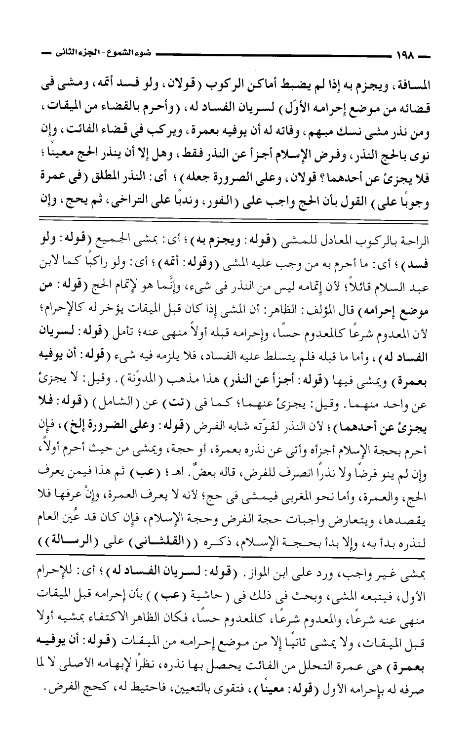 المسافة، ويجزم به إذا لم يضبط أماكن الركوب (قولان، ولو فسد أتمه، ومشى في قضائه من موضع إحرامه الأول) لسريان الفساد له، (وأحرم بالقضاء من الميقات، ومن نذر مشى نسك مبهم، وفاته له أن يوفيه بعمرة، ويركب في قضاء الفائت، وإن نوى بالحج النذر، وفرض الإسلام أجزأ عن النذر فقط، وهل إلا أن ينذر الحج معينًا؛ فلا يجزئ عن أحدهما؟ قولان، وعلى الصرورة جعله)؛ أي: النذر المطلق (في عمرة وجوبًا على) القول بأن الحج واجب على (الفور، وندبًا على التراخي، ثم يحج، وإن