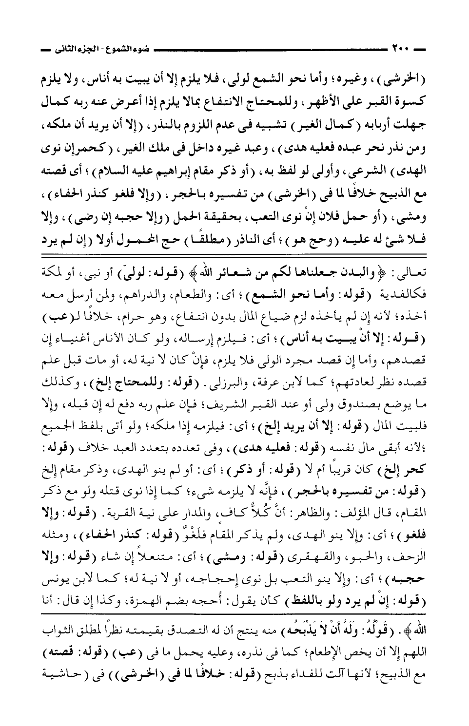 (الخرشي)، وغيره؛ وأما نحو الشمع لولى، فلا يلزم إلا أن ببيت به أناس، ولا يلزم كسوة القبر على الأظهر، وللمحتاج الانتفاع بمالا يلزم إذا أعرض عنه ربه كمال جهلت أربابه (كمال الغير) تشبيه في عدم اللزوم بالنذر، (إلا أن يريد أن ملكه، ومن نذر نحر عبده فعليه هدى)، وعبد غيره داخل في ملك الغير، (كحمر إن نوى الهدى) الشرعي، وأولى لو لفظ به، (أو ذكر مقام إبراهيم عليه السلام)؛ أي قصته مع الذبيح خلافًا لما في (الخرشي) من تفسيره بالحجر، (وإلا فلغو كنذر الحفاء)، ومشى، (أو حمل فلان إن نوى التعب، بحقيقة الحمل (وإلا حجبه إن رضى)، وإلا فلا شيء له عليه (وحج هو)؛ أي الناذر (مطلقًا) حج المحمول أو لا (إن لم يرد