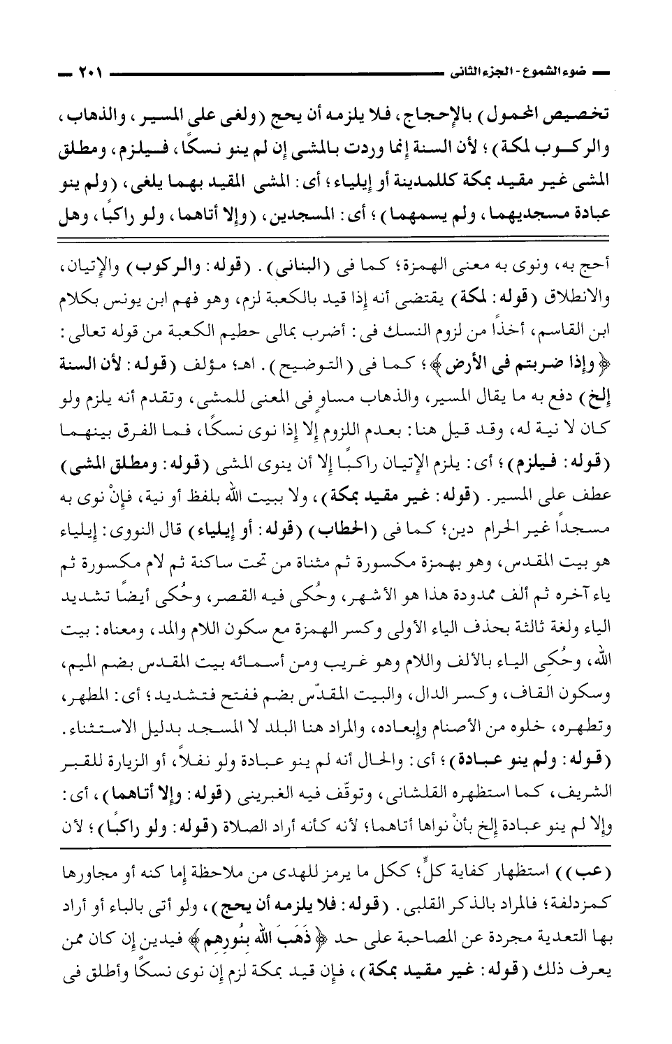 أحج به، ونوى به معنى الهمزة؛ كما في (البناني). (قوله: والركوب) والإتيان، والانطلاق (قوله: لمكة) يقتضي أنه إذا قيد بالكعبة لزم، وهو فهم ابن يونس بكلام ابن القاسم، أخذًا من لزوم النسك في: أضرب بمالي حطيم الكعبة من قوله تعالى: {وإذا ضربتم في الأرض}؛ كما في (التوضيح). اهـ؛ مؤلف (قوله: لأن السنة إلخ) دفع به ما يقال المسير، والذهاب مساو في المعنى للمشي، وتقدم أنه يلزم ولو كان لا نية له، وقد قيل هنا: بعدم اللزوم إلا إذا نوى نسكًا، فما الفرق بينهما (قوله: فيلزم)؛ أي: يلزم الإتيان راكبًا إلا أن ينوي المشي (قوله: ومطلق المشي) عطف على المسير. (قوله: غير مقيد بمكة)، ولا ببيت الله بلفظ أو نية، فإن نوى به مسجدًا غير الحرام دين؛ كما في (الحطاب) (قوله: أو إيلياء) قال النووي: إيلياء هو بيت المقدس، وهو بهمزة مكسورة ثم مثناة من تحت ساكنة ثم لام مكسورة ثم ياء آخره ثم ألف ممدودة هذا هو الأشهر، وحكى فيه القصر، وحكى أيضًا تشديد الياء ولغة ثالثة بحذف الياء الأولى وكسر الهمزة مع سكون اللام والمد، ومعناه: بيت الله، وحكى الياء بالألف واللام وهو غريب ومن أسمائه بيت المقدس بضم الميم، وسكون القاف، وكسر الدال، والبيت المقدس بضم ففتح فتشديد؛ أي: المطهر وتطهره، خلوه من الأصنام وإبعاده، والمراد هنا البلد لا المسجد بدليل الاستثناء. (قوله: ولم ينو عبادة)؛ أي: والحال أنه لم ينو عبادة ولو نفلًا، أو الزيارة للقبر الشريف، كما استظهره القلشاني، وتوقف فيه الغبريني (قوله: وإلا أتاهما)، أي: وإلا لم ينو عبادة إلخ بأن نواها أتاهما؛ لأنه كأنه أراد الصلاة (قوله: ولو راكبًا)؛ لأن