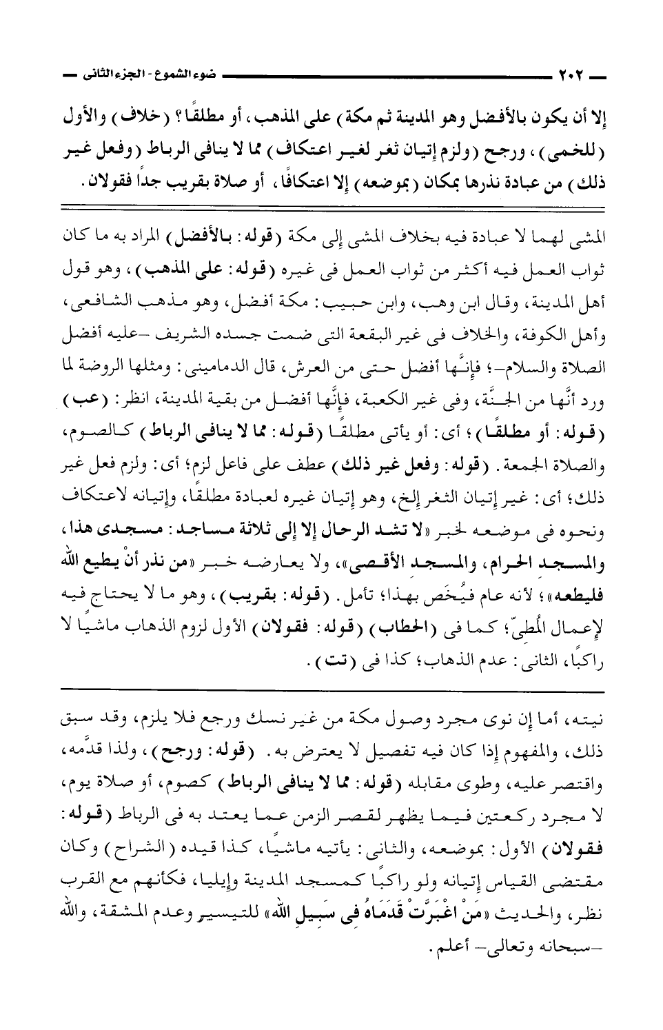 نيته، أما إن نوى مجرد وصول مكة من غير نسك ورجع فلا يلزم، وقد سبق ذلك، والمفهوم إذا كان فيه تفصيل لا يعترض به. (قوله: ورجح)، ولذا قدمه، واقتصر عليه، وطوى مقابله (قوله: مما لا ينافي الرباط) كصوم، أو صلاة يوم، لا مجرد ركعتين فيما يظهر لقصر الزمن عما يعتد به في الرباط (قوله: فقولان) الأول: بموضعه، والثاني: يأتيه ماشيًا، كذا قيده (الشراح) وكان مقتضى القياس إتيانه ولو راكبًا كمسجد المدينة وإيليا، فكأنهم مع القرب نظر، والحديث "من اغبرت قدماه في سبيل الله" للتيسير وعدم المشقة، والله- سبحانه وتعالى- أعلم.