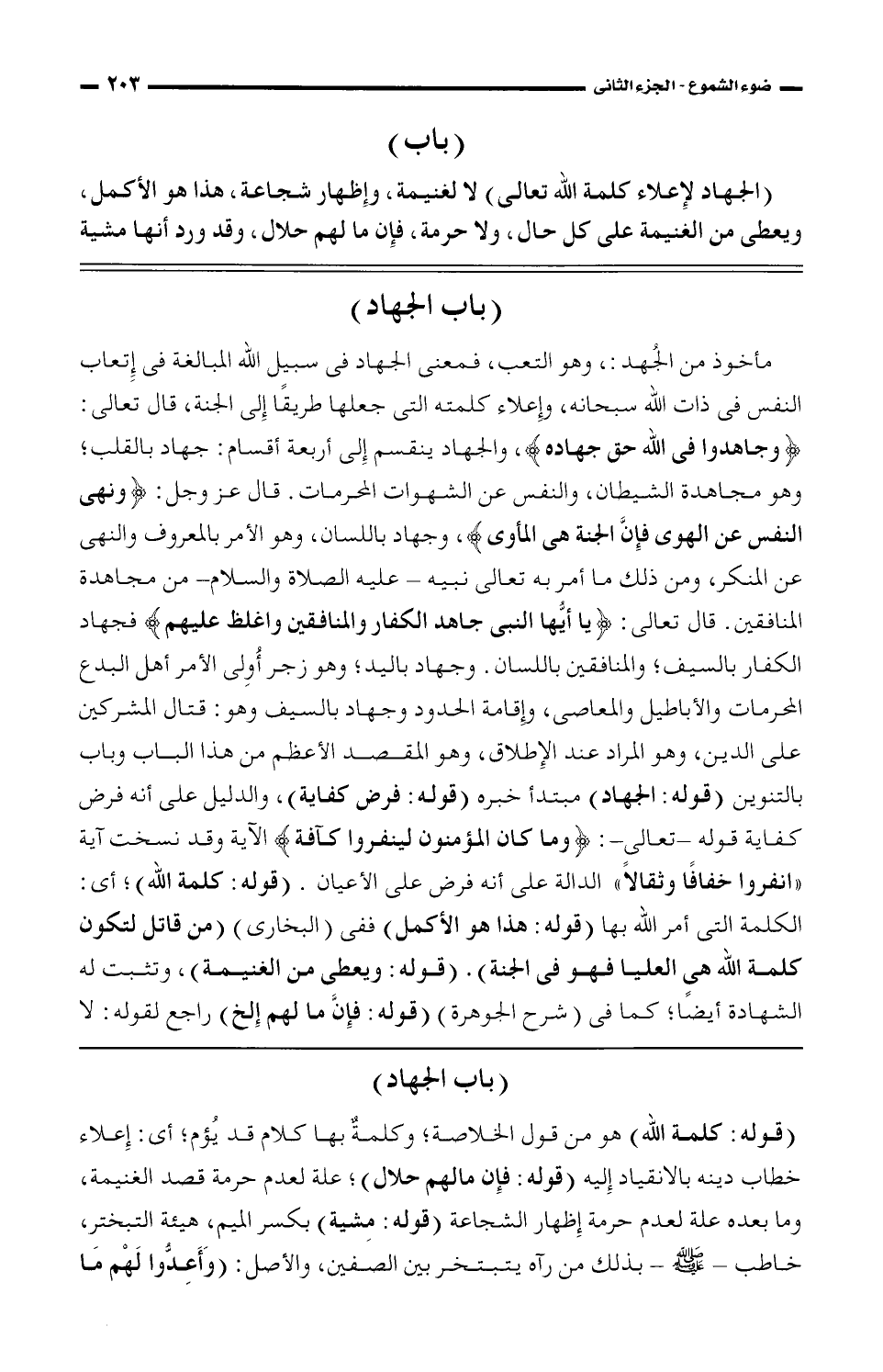 مأخوذ من الجهد: وهو التعب، فمعنى الجهاد في سبيل الله المبالغة في إتعاب النفس في ذات الله سبحانه، وإعلاء كلمته التي جعلها طريقًا إلى الجنة، قال تعالى: {وجاهدوا في الله حق جهاده}، والجهاد ينقسم إلى أربعة أقسام: جهاد بالقلب؛ وه مجاهدة الشيطان، والنفس عن الشهوات المحرمات. قال عز وجل: {ونهى النفس عن الهوى فإن الجنة هي المأوى}، وجهاد باللسان، وهو الأمر بالمعروف والنهي عن المنكر، ومن ذلك ما أمر به تعالى نبيه- عليه الصلاة والسلام- من مجاهدة المنافقين. قال تعالى: {يا أيها النبي جاهد الكفار والمنافقين واغلظ عليهم} فجهاد الكفار بالسيف؛ والمنافقين باللسان. وجهاد باليد؛ وهو زجر أولي الأمر أهل البدع المحرمات والأباطيل والمعاصي، وإقامة الحدود وجهاد بالسيف وهو: قتال المشركين على الدين، وهو المراد عند الإطلاق، وهو المقصود الأعظم من هذا الباب وباب بالتنوين (قوله: الجهاد) مبتدأ خبره (قوله: فرض كفاية)، والدليل على أنه فرض كفاية قوله- تعالى-: {وما كان المؤمنون لينفروا كافة} الآية وقد نسخت آية "انفروا خفافًا وثقالًا" الدالة على أنه فرض على الأعيان. (قوله: كلمة الله)؛ أي: الكلمة التي أمر الله بها (قوله: هذا هو الأكمل) ففي (البخاري) (من قاتل لتكون كلمة الله هي العليا فهو في الجنة). (قوله: ويعطى من الغنيمة)، وتثبت له الشهادة أيضًا؛ كما في (شرح الجوهرة) (قوله: فإن ما لهم إلخ) راجع لقوله: لا