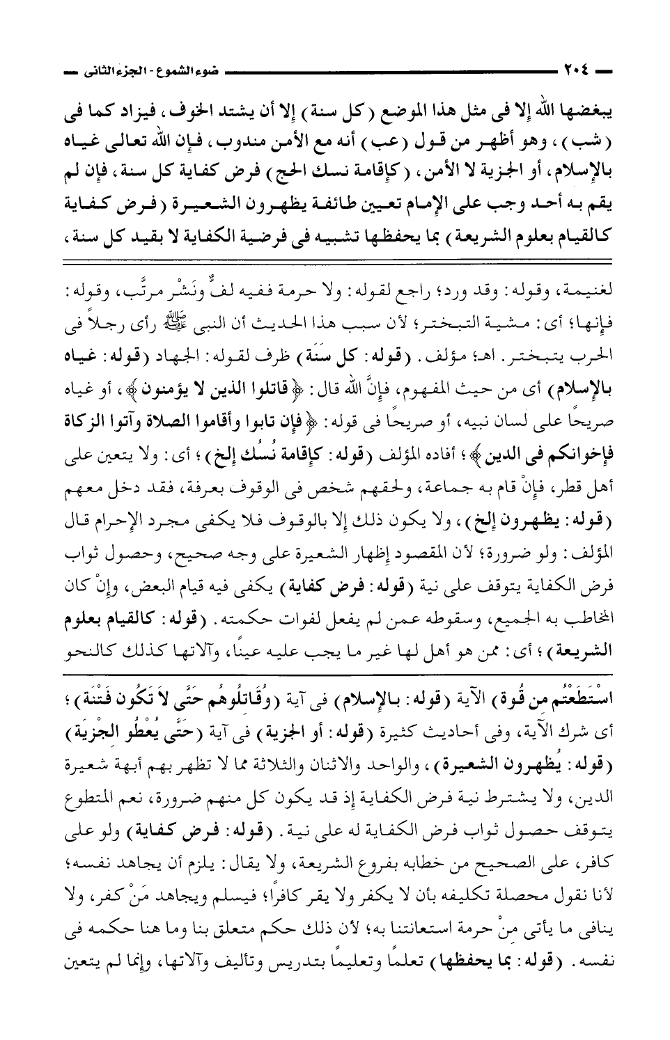 لغنيمة، وقوله: وقد ورد؛ راجع لقوله: ولا حرمة ففيه لف ونشر مرتب، وقوله: فإنها؛ أي: مشية التبختر؛ لأن سبب هذا الحديث أن النبي صلى الله عليه وسلم رأى رجلا في الحرب يتبختر. اهـ؛ مؤلف. (قوله: كل سنة) ظرف لقوله: الجهاد (قوله: غياه بالإسلام) أي من حيث المفهوم، فإن الله قال: {قاتلوا الذين لا يؤمنون}، أو غياه صريحًا على لسان نبيه، أو صريحًا في قوله: {فإن تابوا وأقاموا الصلاة وآتوا الزكاة فإخوانكم في الدين}؛ أفاده المؤلف (قوله: كإقامة نسك إلخ)؛ أي: ولا يتعين على أهل قطر، فإن قام به جماعة، ولحقهم شخص في الوقوف بعرفة، فقد دخل معهم (قوله: يظهرون إلخ)، ولا يكون ذلك إلا بالوقوف فلا يكفي مجرد الإحرام قال المؤلف: ولو ضرورة؛ لأن المقصود إظهار الشعيرة على وجه صحيح، وحصول ثواب فرض الكفاية يتوقف على نية (قوله: فرض كفاية) يكفي فيه قيام البعض، وإن كان المخاطب به الجميع، وسقوطه عمن لم يفعل لفوات حكمته. (قوله: كالقيام بعلوم الشريعة)؛ أي: ممن هو أهل لها غير ما يجب عليه عينًا، وآلاتها كذلك كالنحو