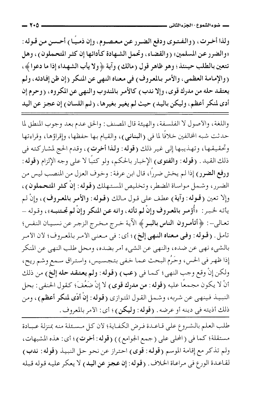 واللغة، والأصول لا الفاسقة، والهيئة قال المصنف: والحق عدم بعد وجوب المنطق لما حدثت شبه المخالفين خلافًا لما في (البناني)، والقيام بها حفظها، وإقراؤها، وقراءتها وتحقيقها، وتهذيبها لي غير ذلك (قوله: ولذا أخرت)، وقدم الحج لمشاركته في ذلك القيد. (قوله: والفتوى) الإخبار بالحكم، ولو كتبًا لا على وجه الإلزام (قوله: ورفع الضرر) إذا لم يخش ضررًا، قال ابن عرفة: وخوف العزل من المنصب ليس من الضرر، وشمل مواساة المضطر، وتخليص المستهلك (قوله: إن كثر المتحملون)، وإلا تعين (قوله: وآية) عطف على قول مالك (قوله: والأمر بالمعروف)، وإن لم يأته لخبر: "أؤمر بالمعروف وإن لم تأته، وإنه عن المنكر وإن لم تجتنبه"، وقوله- تعالى-: {أتأمرون الناس بالبر} الآية خرج مخرج الزجر عن نسيان النفس؛ تأمل. (قوله: وفي معناه النهي إلخ)؛ أي: في معنى الأمر بالمعروف؛ لأن الأمر بالشيء نهي عن ضده. والنهي عن الشيء أمر بضده، ومحل اطلب النهي عن المنكر إذا ظهر في الحس، وحرم البحث عما خفى بتجسيس، واستراق سمع وشم ريح، ولكن إن وقع وجب النهي؛ كما في (عب) (قوله: ولم يعتقد حله إلخ) من ذلك أن لا يكون مجمعًا عليه (قوله: من مدرك قوي) لا إن ضعف؛ كقول الحنفي: بحل النبيذ فينهى عن شربه، وشمل القول المتوازي (قوله: إن أدى لمنكر أعظم)، ومن ذلك أذيته في دينه أو عرضه. (قوله: وليكن)؛ أي: الأمر بالمعروف.
