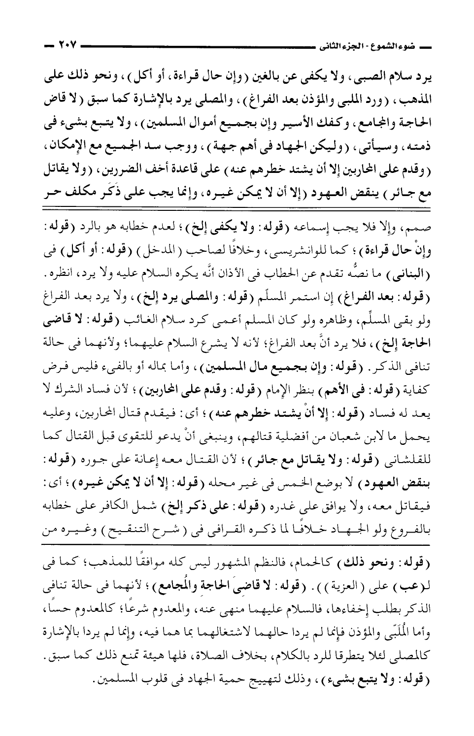 صمم، وإلا فلا يجب سماعه (قوله: ولا يكفي إلخ)؛ لعدم خطابه هو بالرد (قوله: وإن حال قراءة)؛ كما للوانشريسي، وخلافًا لصاحب (المدخل) (قوله: أو أكل) في (البناني) ما نصه تقدم عن الخطاب في الأذان أنه يكره السلام عليه ولا يرد، انظره. (قوله: بعد الفراغ) إن استمر المسلم (قوله: والمصلي يرد إلخ)، ولا يرد بعد الفراغ ولو بقى المسلم، وظاهره ولو كان المسلم أعمى كرد سلام الغائب (قوله: لا قاضي الحاجة إلخ)، فلا يرد أن بعد الفراغ؛ لأنه لا يشرع السلام عليهما؛ ولأنهما في حالة تنافي الذكر. (قوله: وإن بجميع مال المسلمين)، وأما بماله أو بالفيء فليس فرض كفاية (قوله: في الأهم) بنظر الإمام (قوله: وقدم على المحاربين)، لأن فساد الشرك لا يعد له فساد (قوله: إلا أن يشتد خطرهم عنه)؛ أي: فيقدم قتال المحاربين، وعليه يحمل ما لابن شعبان من أفضلية قتالهم، وينبغي أن يدعو للتقوى قبل القتال كما للقلشاني (قوله: ولا يقاتل مع جائر)؛ لأن القتال معه إعانة على جوره (قوله: بنقض العهود) لا بوضع الخمس في غير محله (قوله: إلا أن لا يمكن غيره)؛ أي: فيقاتل معه، ولا يوافق على غدره (قوله: على ذكر إلخ) شمل الكافر على خطابه بالفروع ولو الجهاد خلافًا لما ذكره القرافي في (شرح التنقيح) وغيره من