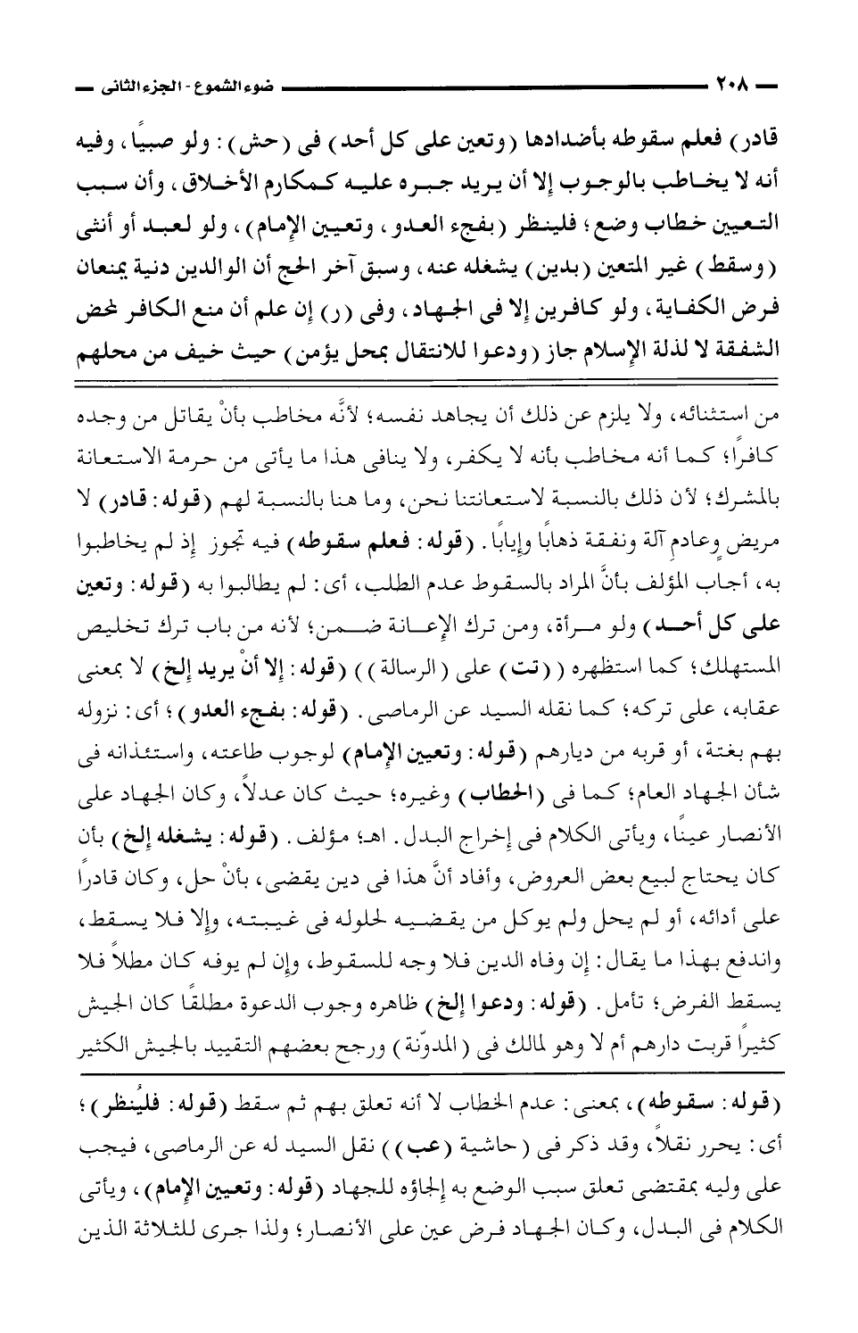 من استثنائه، ولا يلزم عن ذلك أن يجاهد نفسه؛ لأنه مخاطب بأن يقاتل من وجده كافرًا؛ كما أنه مخاطب بأنه لا يكفر، ولا ينافي هذا ما يأتي من حرمة الاستعانة بالمشرك؛ لأن ذلك بالنسبة لاستعانتنا نحن، وما هنا بالنسبة لهم (قوله: قادر) لا مريض وعادم آلة ونفقة ذهابًا وإيابًا. (قوله: فعلم سقوطه) فيه تجوز إذ لم يخاطبوا به، أجاب المؤلف بأن المراد بالسقوط عدم الطلب، أي: لم يطالبوا به (قوله: وتعين على كل أحد) ولو مرأة، ومن ترك الإعانة ضمن؛ لأنه من باب ترك تخليص المستهلك؛ كما استظهره ((تت) على (الرسالة)) (قوله: إلا أن يريد إلخ) لا بمعنى عقابه، على تركه؛ كما نقله السيد عن الرماضي. (قوله: بفجء العدو)؛ أي: نزوله بهم بغتة، أو قربه من ديارهم (قوله: وتعيين الإمام) لوجوب طاعته، واستئذانه في شأن الجهاد العام؛ كما في (الحطاب) وغيره؛ حيث كان عدلًا، وكان الجهاد على الأنصار عينًا، ويأتي الكلام في إخراج البدل. اهـ؛ مؤلف. (قوله: يشغله إلخ) بأن كان يحتاج لبيع بعض العروض، وأفاد أن هذا في دين يقضي بأن حل، وكان قادرًا على أدائه، أو لم يخل ولم يوكل من يقضيه لحلوله في غيبته، وإلا فلا يسقط، واندفع بهذا ما يقال: إن وفاه الدين فلا وجه للسقوط، وإن لم يوفه كان مطلًا فلا يسقط الفرض؛ تأمل. (قوله: ودعوا إلخ) ظاهره وجوب الدعوة مطلقًا كان الجيش كثيرًا قربت دارهم أم لا وهو لمالك في (المدونة) ورجح بعضهم التقييد بالجيش الكثير