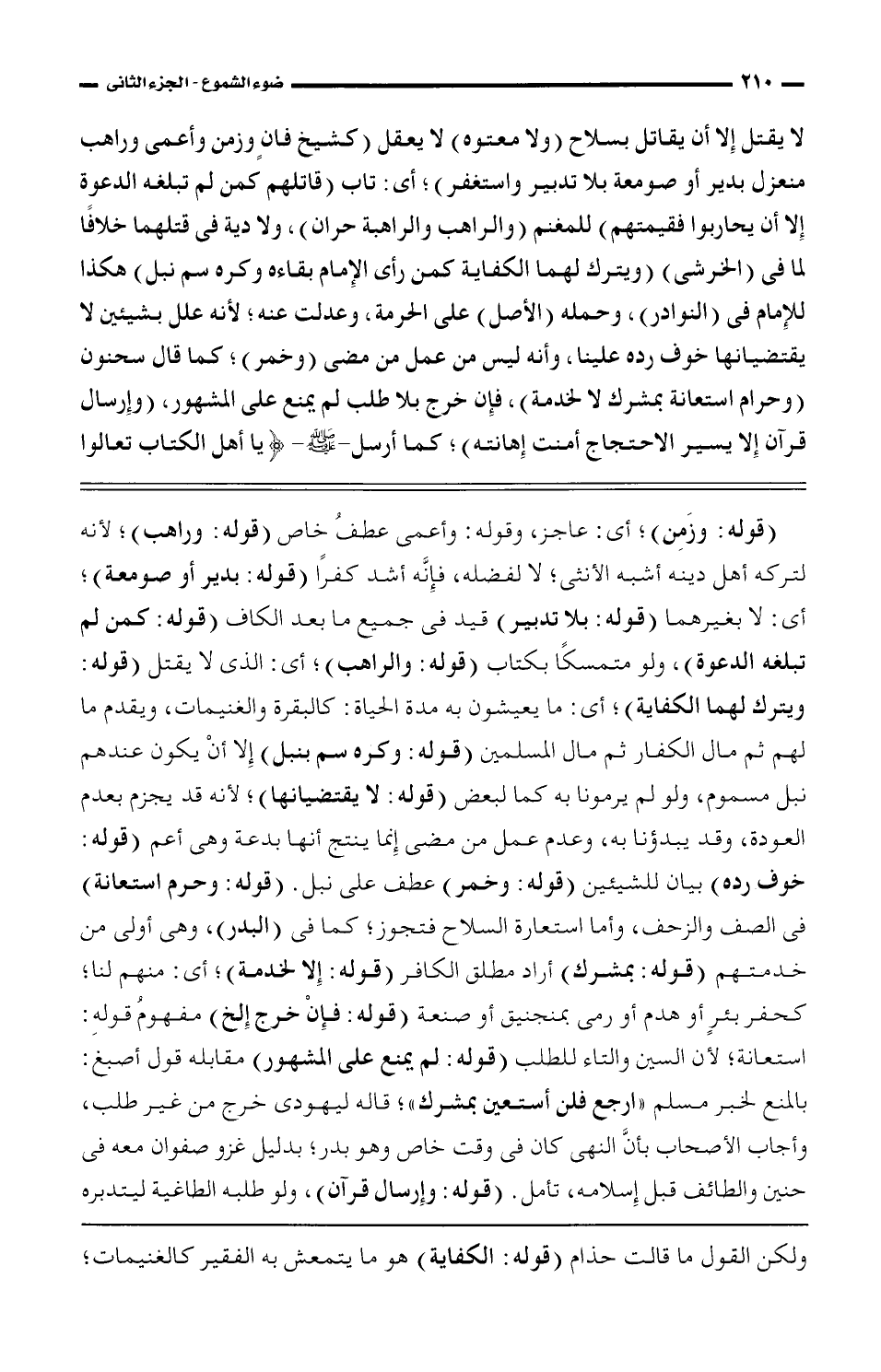 (قوله: وزمن)؛ أي: عاجز، وقوله: وأعمى عطف خاص (قوله: وراهب)؛ لأنه لتركه أهل دينه أشبه الأنثى؛ لا لفضله، فإنه أشد كفرًا (قوله: بدير أو صومعة)؛ أي: لا بغيرها (قوله: بلا تدبير) قيد في جميع ما بعد الكاف (قوله: كمن لم تبلغه الدعوة)، ولو متمسكًا بكتاب (قوله: والراهب)؛ أي: الذي لا يقتل (قوله: ويترك لهما الكفاية)؛ أي: ما يعيشون به مدة الحياة: كالبقرة والغنيمات، ويقدم ما لهم ثم مال الكفار ثم مال المسلمين (قوله: وكره سم بنبل) إلا أن يكون عندهم نبل مسموم، ولو لم يرمونا به كما لبعض (قوله: لا يقتضيانها)؛ لأنه قد يجزم بعدم العودة، وقد يبدؤنا به، وعدم عمل من مضى إنما ينتج أنها بدعة وهي أعم (قوله: خوف رده) بيان للشيئين (قوله: وخمر) عطف على نبل. (قوله: وحرم استعانة) في الصف والزحف، وأما استعارة السلاح فتجوز؛ كما في (البدر)، وهي أولى من خدمتهم (قوله: بمشرك) أراد مطلق الكافر (قوله: إلا لخدمة)؛ أي: منهم لنا؛ كحفر بئر أو هدم أو رمى بمنجنيق أو صنعة (قوله: فإن خرج إلخ) مفهوم قوله: استعانة؛ لأن السين والتاء للطلب (قوله: لم يمنع على المشهور) مقابله قول أصبغ: بالمنع لخبر مسلم "ارجع فلن أستعين بمشرك"؛ قاله ليهودي خرج من غير طلب، وأجاب الأصحاب بأن النهي كان في وقت خاص وهو بدر؛ بدليل غزو صفوان معه في حنين والطائف قبل إسلامه، تأمل. (قوله: وإرسال قرآن). ولو طلبه الطاغية ليتدبره