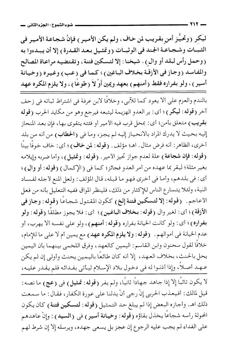 بالندم والعزم على ألا يعود كما للآبي، وخلافًا لابن عرفة في اشتراط ثباته في زحف آخر (قوله: ليكر)؛ أي: ير العدو الهزيمة ليتبعه فيرجع وهو من مكايد الحرب (قوله بقريب) متعلق بأمن؛ أي: بمحل قرب فيه الأمير أو فئته يتقوى بها، فإن بعد المنحاز إليه بحيث لا يدرك المراد بالانحياز إليه لم يجز، وما في (الحطاب) من أنه من بلد أخرى، الظاهر: أنه فرض مثال. اهـ؛ مؤلف. (قوله: لمن خاف)؛ أي: خاف خوفًا بينًا (قوله: فإن شجاعة) علة لعدم جواز تحيز الأمير. (قوله: وتمثيل)، وأما ضربه وإيلامه بغير مثله؛ ليقر بما عهده من أمر العدو فجائز؛ كما في (الإكمال) (قوله: أو وال)؛ أي: في بلدهم، وأما في أخرى فهو ما قبله، قال المؤلف: ولعل المنع لأجله لفساد النية، ولئلا يتسارع الناس للإكثار من ذلك، فلينظر المواق نفيه التعليل بأنه من فعل الأعاجم. (قوله: إلا لتسكين فتنة إلخ) ككون المقتول شجاعًا (قوله: وجاز في الأزقة)؛ أي: لغير وال (قوله: بخلاف الباغين)؛ أي: فلا يجوز مطلقًا (قوله: ولو بفراره)؛ أي: ولو كنت الخيانة بفراره (قوله: أمنهم)، ولو على نفسه ألا يهرب، أو عدم الخيانة في أموالهم. (قوله: ولا يلزم المكره عهد) مع يمين أم لا على ما للإمام، خلافًا لقول سحنون وابن القاسم: اليمين كالعهد، وفرق اللخمي بينهما بأن اليمين يحل بالحنث، بخلاف العهد، إلا أنه كان طائعًا باليمين يحنث وأولى إن لم يكن عهد أصلًا، وإذا أذنوا له في دخول بلاد الإسلام ليأتي بفدائه فلم يقدر عليه،