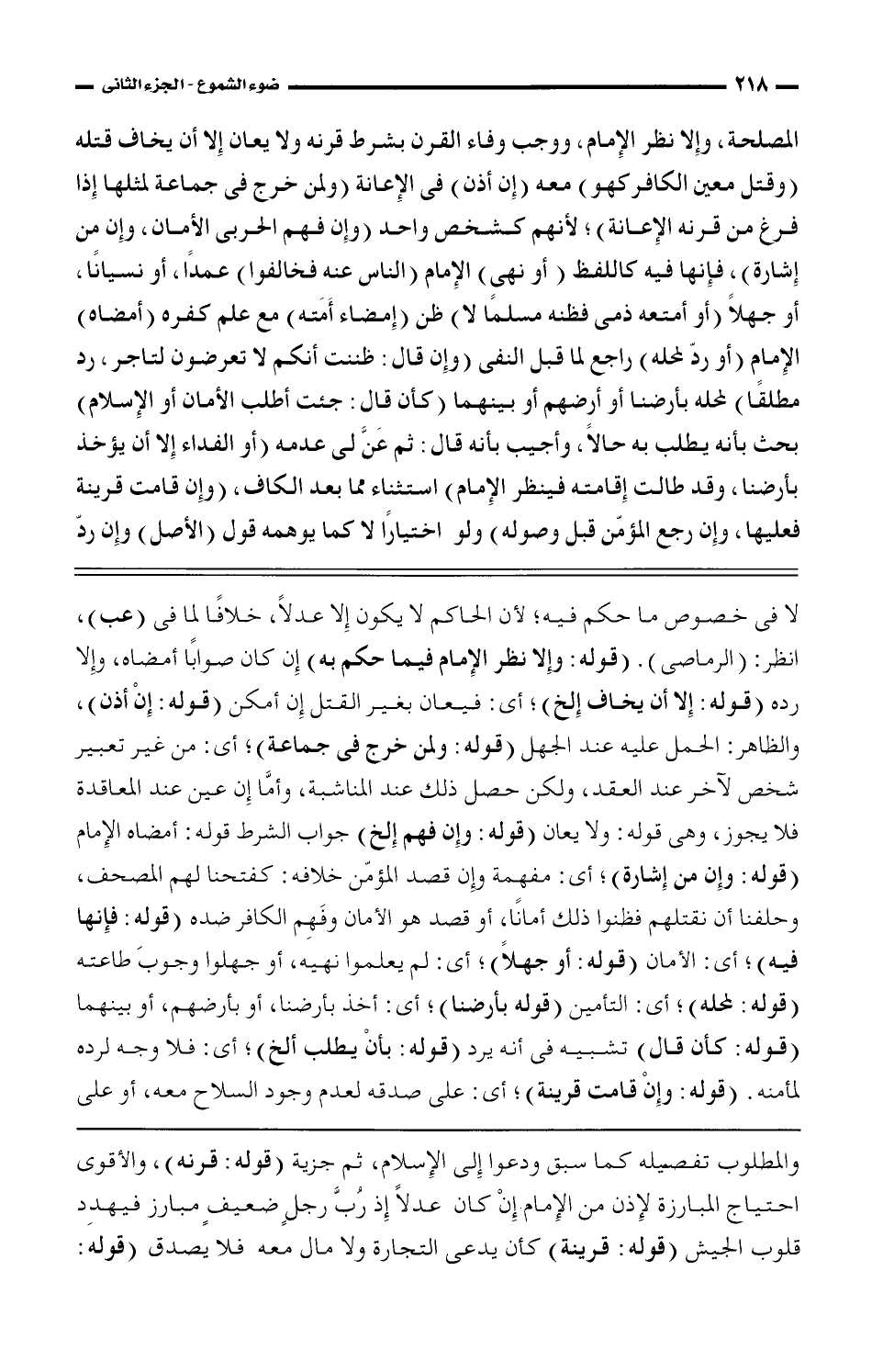 المصلحة، وإلا نظر الإمام، ووجب وفاء القرن بشرط قرنه ولا يعان إلا أن يخاف قتله (وقتل معين الكافر كهو) معه (إن أذن) في الإعانة (ولمن خرج في جامعة لمثلها إذا فرغ من قرنه الإعانة)؛ لأنهم كشخص واحد (وإن فهم الحربي الأمان، وإن من إشارة) فإنها فيه كاللفظ (أو نهى) الإمام (الناس عنه فخالفوا) عمدًا، أو نسيانًا، أو جهلًا (أو أمتعة ذمي فظنه مسلمًا لا) ظن (إمضاء أمته) مع علم كفره (أمضاه) الإمام (أو رد لمحله) راجع لما قبل النفي (وإن قال: ظننت أنكم لا تعرضون لتاجر، رد مطلقًا) لمحله بأرضنا أو أرضهم أو بينهما (كأن قال: جئت أطلب الأمان أو الإسلام) بحث بأنه يطلب به حالًا، وأجيب بأنه قال: ثم عن لي عدمه (أو الفداء إلا أن يؤخذ بأرضنا، وقد طالت إقامته فينظر الإمام) استثناء مما بعد الكاف، (وإن قامت قرينة فعليها، وإن رجع المؤمن قبل وصوله) ولو اختيارًا لا كما يوهمه قول (الأصل) وإن رد