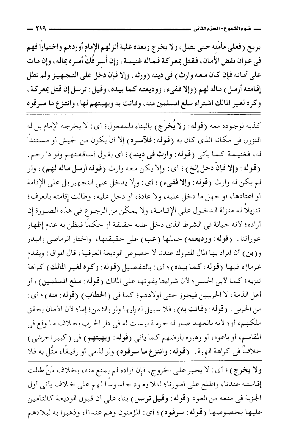 كذبه لوجوده معه (قوله: ولا يخرج) بالبناء للمفعول؛ أي: لا يخرجه الإمام بل له النزول في مكانه الذي كون به (قوله: فلآسره) إلا أن يكون من الجيش أو مستندًا له، فغنيمة كما يأتي (قوله: وارث في دينه)؛ أي بقول أساقفتهم ولو ذا رحم. (قوله: وإلا فإن دخل إلخ)؛ أي: وإلا يكن معه وارث (قوله أرسل ماله لهم)، ولو لم يكن له وارث (قوله: وإلا ففيء)؛ أي: وإلا يدخل على التجهيز بل على الإقامة أو اعتادها، أو جهل ما دخل عليه، ولا عادة، أو دخل عليه، وطالت إقامته بالعرف؛ تنزيلًا له منزلة الدخول على الإقامة، ولا يمكن من الرجوع في هذه الصورة إن أراده؛ لأنه خيانة في الشرط الذي دخل عليه حقيقة أو حكمًا فيظن به عدم إظهار عوراتنا. (قوله: ووديعته) حملها (عب) على حقيقتها، واختيار الرماصي والبدر و (بن) أن المراد بها المال المتروك عندنا لا خصوص الوديعة العرفية، قال المواق: ويقدم غرماؤه فيها (قوله: كما بيده)؛ أي: بالتفصيل (قوله: وكره لغير المالك) كراهة تنزيه؛ كما لأبي الحسن؛ لأن شراءها يفوتها على المالك (قوله: سلع المسلمين)، أو أهل الذمة، لا الحربيين فيجوز حتى أولادهم؛ كما في (الحطاب) (قوله: منه)؛ أي: من الحربي. (قوله: وفاتت به)، فلا سبيل له إليها ولو بالثمن؛ إما؛ لأن الأمان يحقق ملكهم، أو؛ لأنه بالعهد صار له حرمة ليست له في دار الحرب بخلاف ما وقع في المقاسم، أو باعوه، أو وهبوه بأرضهم كما يأتي (قوله: وبهبتهم) في (كبير الخرشي) خلاف في كراهة الهبة. (قوله: وانتزع ما سرقوه) ولو لذمى أو رقيقًا، مثل به فلا