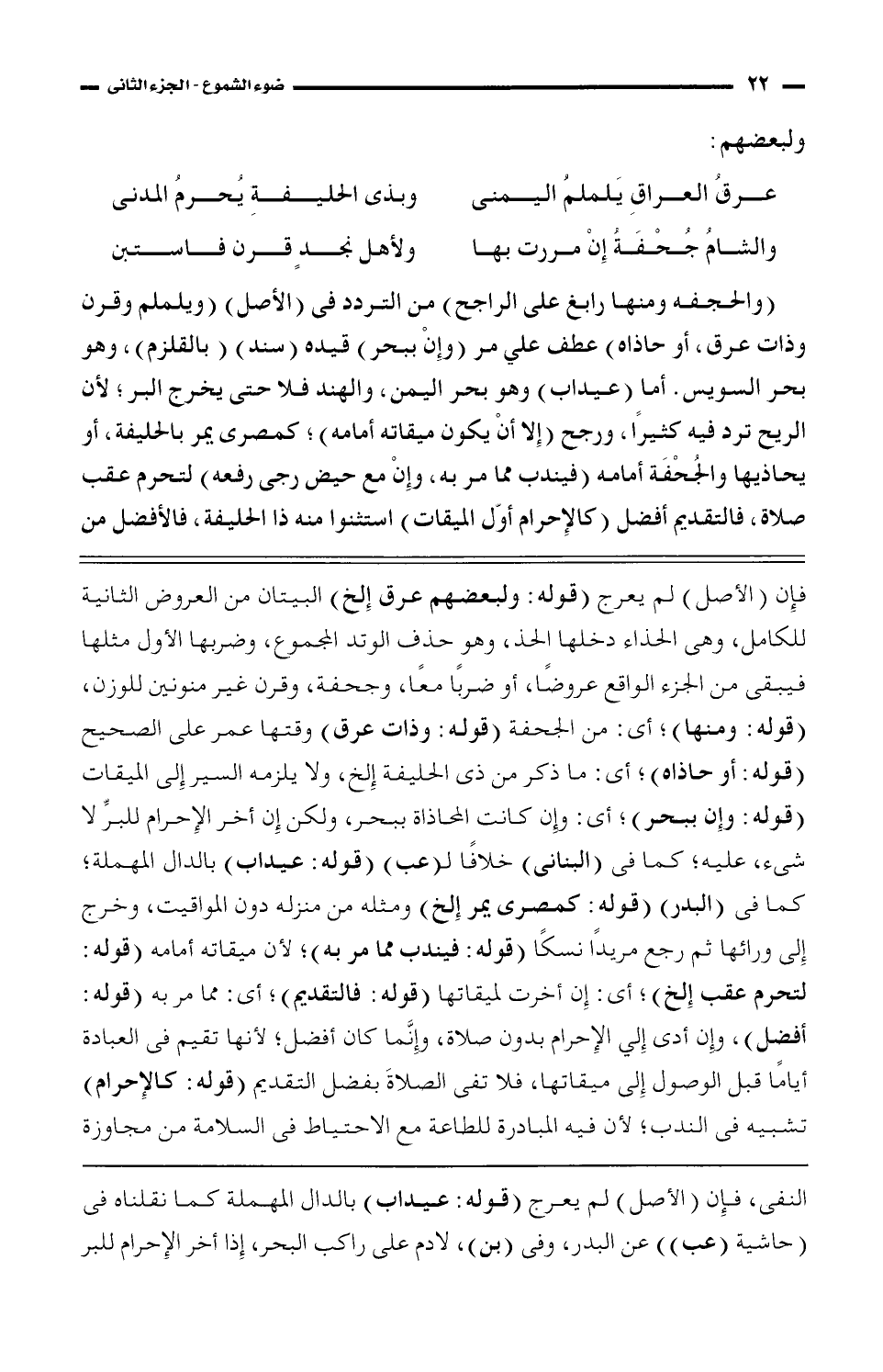 فإن (الأصل) لم يعرج (قوله: ولبعضهم عرق إلخ) البيتان من العروض الثانية للكامل، وهى الحذاء دخلها الحذ، وهو حذف الوتد المجموع، وضربها الأول مثلها فيبقى من الجزء الواقع عروضًا، أو ضربًا معًا، وجحفة، وقرن غير منونين للوزن، (قوله: ومنها)؛ أى: من الجحفة (قوله: وذات عرق) وقتها عمر على الصحيح (قوله: أو حاذاه)؛ أى: ما ذكر من ذى الحليفة إلخ، ولا يلزمه السير إلى الميقات (قوله: وإن ببحر)؛ أى: وإن كانت المحاذاة ببحر، ولكن إن أخر الإحرام للبرِّ لا شئ، عليه؛ كما فى (البنانى) خلافًا لـ (عب) (قوله: عيداب) بالدال المهملة؛ كما فى (البدر) (قوله: كمصرة يمر إلخ) ومثله دون المواقيت، وخرج إلى ورائها ثم رجع مريدًا نسكًا (قوله: فيندب مما مر به؛ لأن ميقاته أمامه (قوله: لتحرم عقب إلخ)؛ أى: إِن أخرت لميقاتها (قوله: فالتقديم)؛ أى: مما مر به (قوله: أفضل)، وإن أدى إِلى الإحرام بدون صلاة، وإِنَّما كان أفضل؛ لأنها تقيم فى العبادة أيامًا قبل الوصول إلى ميقاتها، فلا تفى الصلاةَ بفضل التقديم (قوله: كالإحرام) تشبيه فى الندب؛ لأن فيه المبادرة للطاعة مع الاحتياط فى السلامة من مجاوزة