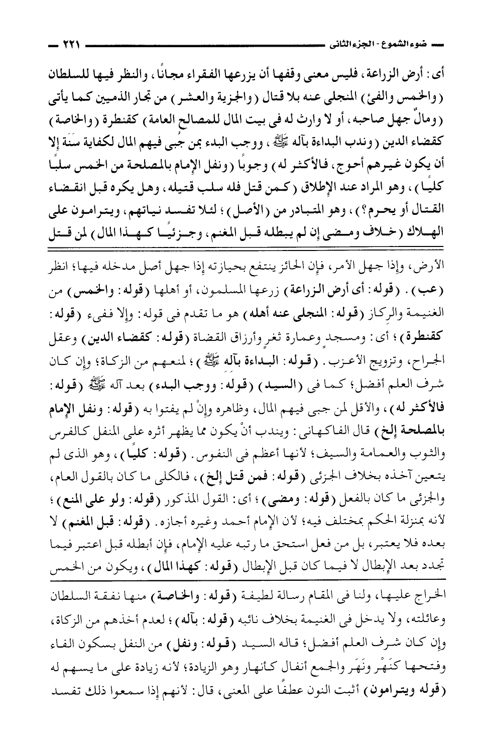 الأرض، وإذا جهل الأمر، فإن الحائ ينتفع بحيازته إذا جهل أصل مدخله فيها؛ انظر (عب). (قوله: أي أرض الزراعة) زرعها المسلمون، أو أهلها (قوله: والخمس) من الغنيمة والركاز (قوله: انجلى عن أهله) هو ما تقدم في قوله: وإلا ففيء (قوله: كقنطرة)؛ أي: ومسجد وعمارة ثغر وأرزاق القضاة (قوله: كقضاء الدين) وعقل الجراح، وتزويج الأعزب. (قوله: البداءة بآله صلى الله عليه وسلم)؛ لمنعهم من الزكاة؛ وإن كان شرف العلم أفضل؛ كما في (السيد) (قوله: ووجب البدء) بعد آله صلى الله عليه وسلم (قوله: فالأكثرية له)، والأقل لمن جبى فيهم المال، وظاهره وإن لم يفتوا به (قوله: ونفل الإمام بالمصلحة إلخ) قال الفاكهاني: ويندب أن يكون مما يظهر أثره على المنفل كالفرس والثوب والعمامة والسيف؛ لأنها أعظم في النفوس. (قوله: كليًا)، وهو الذي لم يتعين آخذه بخلاف الجزئي (قوله: فمن قتل إلخ)، فالكلي ما كان بالقول العام، والجزئي ما كان بالفعل (قوله: ومضى)؛ أي: القول المذكور (قوله: ولو على المنع)؛ لأنه بمنزلة الحكم بمختلف فيه؛ لأن الإمام أحمد وغيره أجازه. (قوله: قبل المغنم) لا بعده فلا يعتبر، بل من فعل استحق ما رتبه عليه الإمام، فإن أبطله قبل اعتبر فيما تحدد بعد الإبطال لا فيما كان قبل الإبطال (قوله: كهذا المال)، ويكون من الخميس