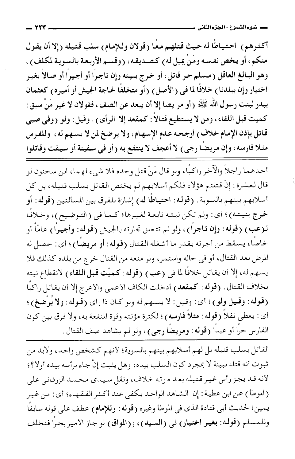 أكثرهم) احتياطًا له حيث قتلهم معًا (قولان وللإمام) سلب قتيله (إلا أن يقول منكم، أو يخص نفسه ومن يميل له) كصديقه، (وقسم الأربعة بالسوية لمكلف)، وهو البالغ العاقل (مسلم حر قاتل، أو خرج بنيته وإن تاجرًا أو أجيرًا أو ضالًا بغير اختيار وإن ببلدنا) خلافًا لما في (الأصل) (أو متخلفًا لحاجة الجيش أو أميره) كعثمان ببدر لبنت رسول الله صلى الله عليه وسلم (أو مر أيضا إلا أن يبعد عن الصف، فقولان لا غير من سبق: كميت قبل اللقاء، ومن لا يستطيع قتالًا: كمقعد إلا الرأي). وقيل: ولو (وفي صبي قاتل بإذن الإمام خلاف) أرجحه عدم الإسهام، ولا يرضخ لمن لا يسهم له، وللفرس مثلًا فارسه، وإن مريضًا رجى) لا أعجف لا ينتفع به (أو في سفينة أو سيقت وقاتلوا
