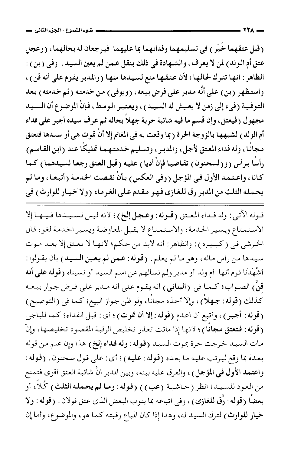 جرى قوله الآتي: وله فداء المعتق (قوله: وعجل الخ)؛ لأنه ليس لسيدها فيها إلا الاستمتاع ويسير الخدمة، والاستمتاع لا يقبل المعاوضة ويسير الخدمة لغو، قال الخرشي في (كبيرة): والظاهر: أنه لا بد من حكم؛ لأنها لا تعتق إلا بعد موت سيدها من رأس ماله، وهو ما لم يعلم (قوله: عمن لم بعين السيد) بأن يقولوا: أشهدنا قوم أنها أم ولد أو مدبر ولم نسألهم عن اسم السيد أو نسيناه (قوله على أنه قن) الصواب؛ كما في (البناني) أنه يقوم على أنه مدبر على فرض جواز بيعه كذلك (قوله: جهلاً)، وإلا أخذه مجانًا، ولو ظن جواز البيع؛ كما في (التوضيح) (قوله: أجبر) ن وأتبع أن أعدم (قوله: إلا أن تموت)؛ أي: قبل الفداء؛ كما للباجي (قوله: فتعتق مجانًا)؛ لأنها إذا ماتت تعذر تخليص الرقبة المقصود تخليصها، وإن مات السيد خرجت حرة بموت السيد (قوله: وله فداء لخ) هذا وإن علم من قوله بعده با وقع ليرتب عليه ما بعده (قوله: عليه)؛ أي: على قول سحنون (قوله: واعتمد الأول في المؤجل)، والفرق عليه بينه، وبين المدبر أن شائبة العتق أقوى فتمنع من العود للسيد؛ أنظر (حاشية (عب) (قوله: وما لم يحمله الثلث) كلا، أو بعضًا (قوله: رق للغازي)، وفي إتباعه بما ينوب البعض الذي عتق قولان، (قوله: ولا خيار للوارث) لترك السيد له، وهذا إذا كان المباع رقبته كما هو، والموضوع، وأما إن