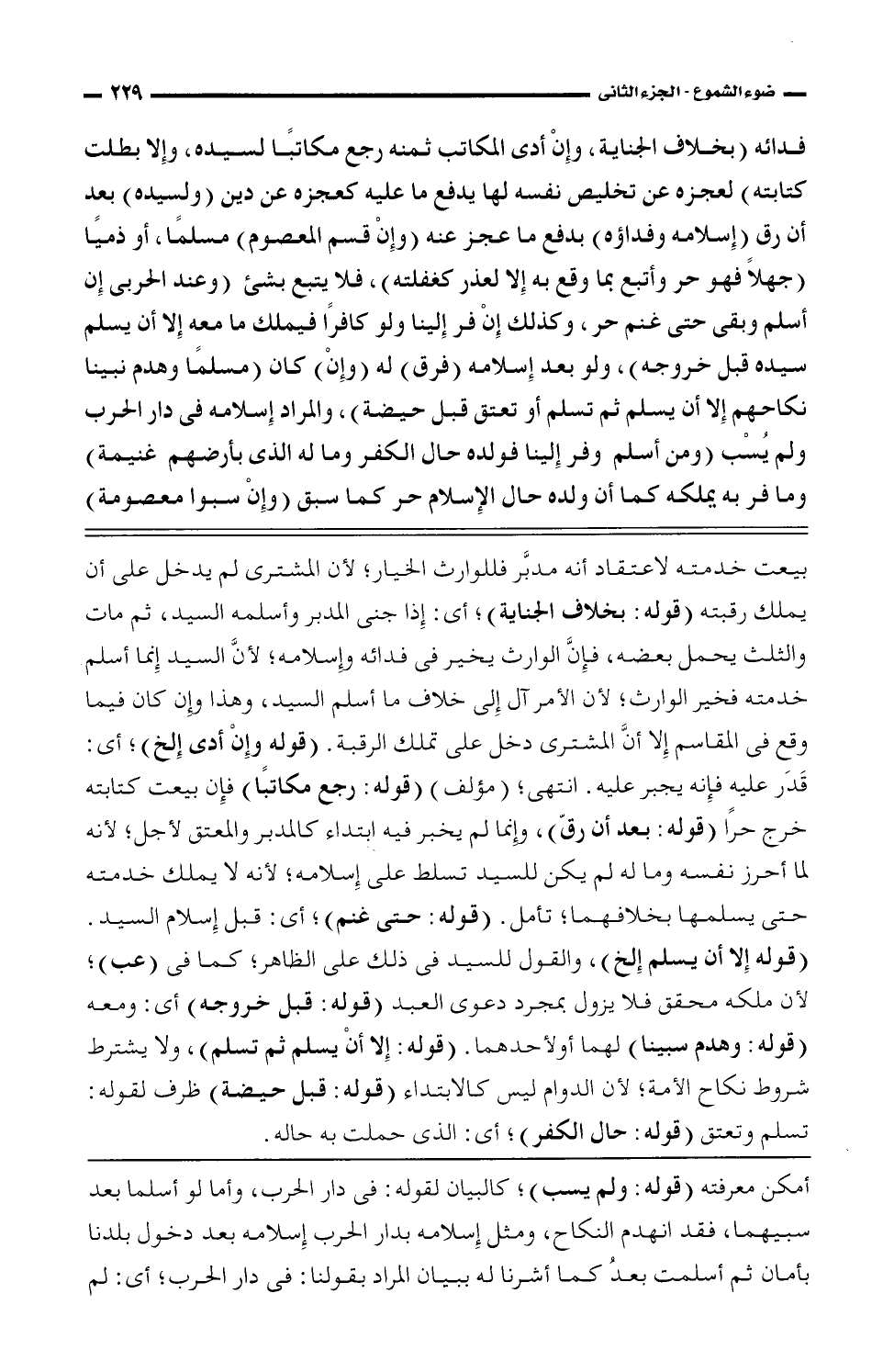 فدائه (بخلاف الجناية، وإن أدي المكاتب ثمنه رجع مكاتبًا لسيد، وإلا بطلت كتابته) لعجزه عن تخليص نفسه لها يدفع ما عليه كعجزه عن دين (ولسيده) بعد أن رق (إسلامه وفداؤه) بدفع ما عجز منه (وإن قسم المعصوم) مسلمًا، أو ذميًا (جهلاً فهو حر وأتبع بما وقع به إلا لعذر كغفلته)، فلا يتبع بشيء (وعند الحربي إن اسلم وبقي حتى غنم حر، وكذلك إن فر إلينا ولو كافرًا فيملك ما معه إلا أن يسلم سيده قبل خروجه)، ولو بعد إسلامه (فرق) له (وإن) كان (مسلمًا وهدم نبينا نكاحهم إلا أن يسلم ثم تسلم أو تعتق قبل حيضة)، والمراد إسلامه في دار الحرب ولم يسب (ومن أسلم وفر إلينا فولده حال الكفر وما له الذي بأرضهم غنيمة) وما فر به يملكه كما ان ولده حال الإسلام حر كما سبق (وإن سبوا معصومة)