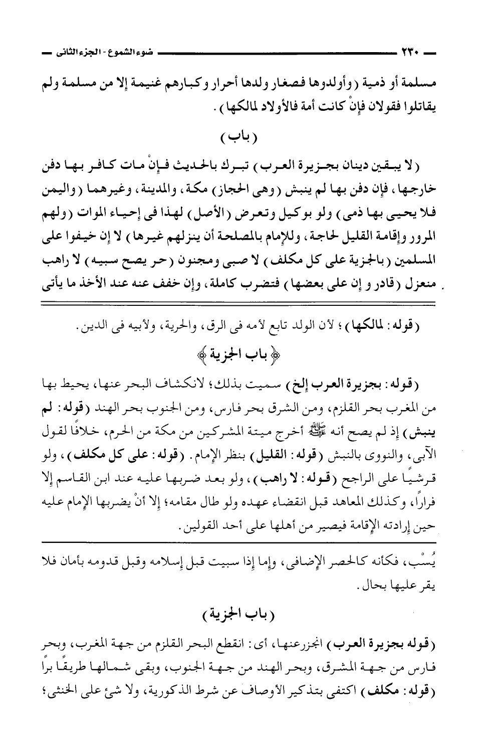 (لا يبقين دينان بجزيرة العرب) تبرك بالحديث فإن مات كافر بها دفن خارجها، فإن دفن بها لم ينبش (وهي الحجاز) مكة، والمدينة، وغيرهما (واليمن فلا يحيا بها ذمي) ولا بوكيل وتعرض (الأصل) لهذا في إحياء الموات (ولهم المرور وإقامة القليل لحاجة، وللإمام بالمصلحة أن ينزلهم غيرها) لا إن خيفوا على المسلمين (بالجزية على كل مكلف) لا صبي ومجنون (حر يصح سبيه) لا راهب منعزل (قادر وإن على بعضها) فتضرب كاملة، وإن خفف عنه عند الأخذ ما يأتي