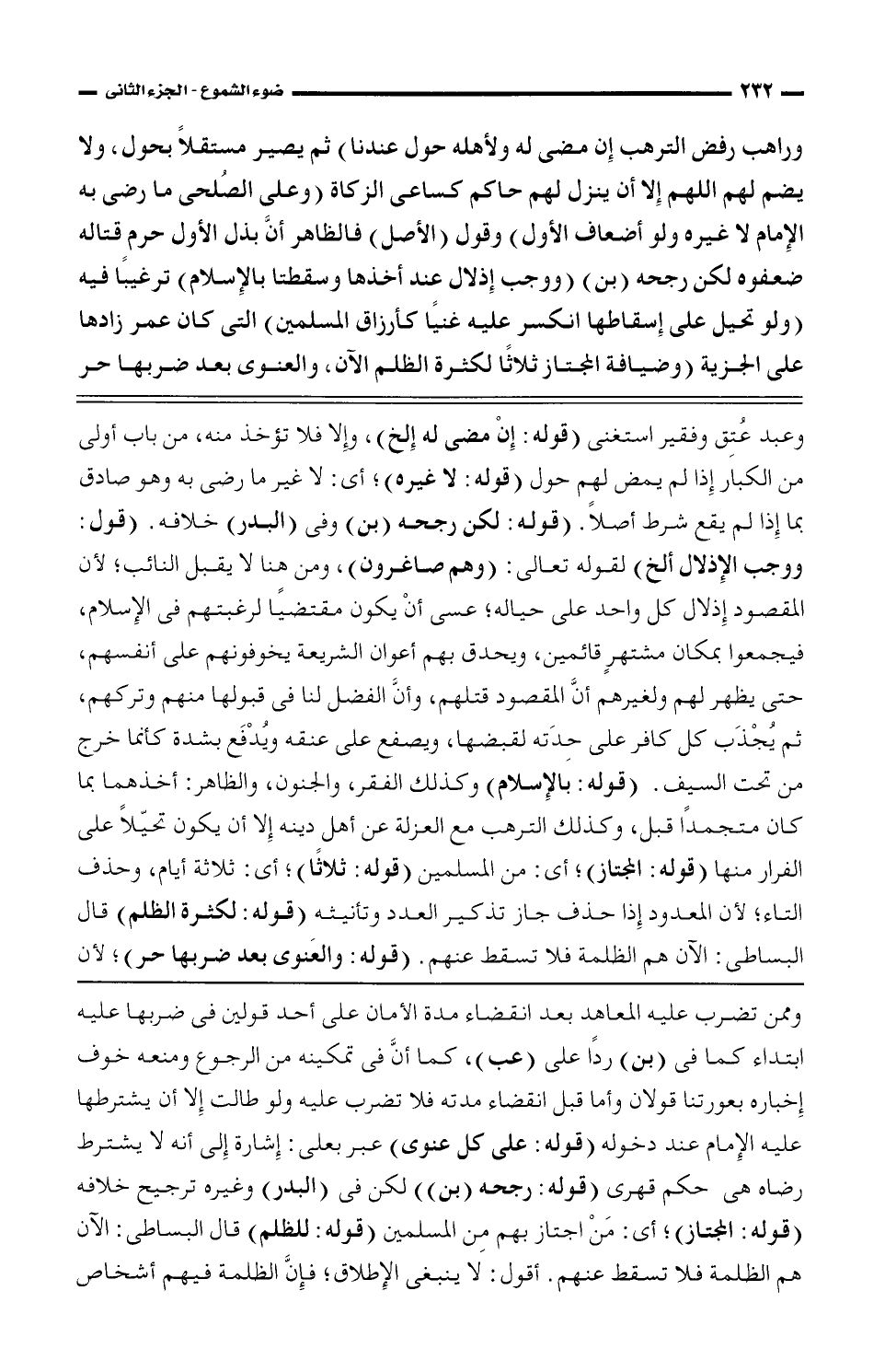 وعبد عتق وفقيرًا استغني (قوله: إن مضي له الخ)، وإلا فلا تؤخذ منه، من باب أولى من الكبار إذا لم يمض لهم حول (قوله: لا غيره)؛ أي: لا غير ما رضي به وهو صادق بما إذا لم يقع شرط أصلاً (قوله: لكن رجحه (بن) وفي (البدر) خلافه (قول: ووجب الإذلال الخ) لقوله تعالى: (وهم صاغرون)، ومن هنا لا يقبل النائب؛ لأن المقصود إذلال كل واحد على حياله؛ عسي أن يكون مقتضيًا لرغبتهم في الإسلام، فيجمعوا بمكان مشتهر قائمين ويحدق بهم أعوان الشريعة يخوفونهم على أنفسهم، حتى يظهر لهم ولغيرهم أن المقصود قتلهم، وأن الفضل لنا في قبولها منهم وتركهم، ثم يجذب كل كافر على حدته لقبضها، ويصفع على عنقه ويدفع بشده كأنما خرج من تحت السيف، (قوله: بالإسلام) وكذلك الفقر، والجنون، والظاهر: أخذهما بما كان متجمدًا قبل، وكذلك الترهب مع العزلة عن أهل دينه إلا أن يكون تحيلاً على الفرار منها (قوله: المجتاز)؛ أي: من المسلمين (قوله: ثلاثًا)؛ أي ثلاثة أيام، وحذف التاء؛ لأن المعدود إذا حذف جاز تذكير العدد وتأنيثه (قوله: لكثرة الظلم) قال البساطي: الآن هم الظلمة فلا تسقط عنهم (قوله والعنوي بعد ضربها حر)؛ لأن