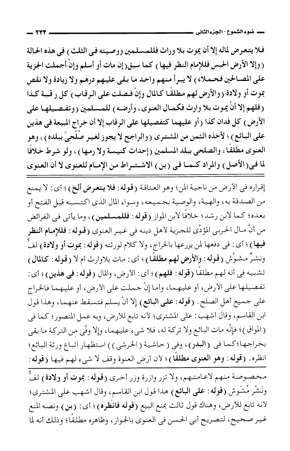 إقراره في الأرض من ناحية المن، وهو العتاقة (قوله: فلا يتعرض الخ)؛ أي لا يمنع من الصدقة به، والهبة، والوصية بجميعه وسواء المال الذي اكتسبه قبل الفتح أو بعده؛ كما لابن رشد؛ خلافًا لابن المواز (قوله: فللمسلمين)، وما يأتي في الفرائض من أن مال الحربي المؤدي للجزية لأهل دينه في غير العنوي (قوله: فللإمام النظر فيها)؛ أي: في دفعها لمن يزرعها بالخراج، ولا كلام لورثته (قوله: بموت أو والدة) لف ونشر مشوش (قوله: ولأرض لهم مطلقًا)؛ أي: مات بلا وارث أم لا (قوله: كالمال) تشبيه في أنه لهم مطلقًا (قوله: فلهم)؛ أي الأرض، والمال (قوله: في هذين)؛ أي: تفصيلها على الأرض، وعليهما، وأما إن جملت على الأرض، أو عليهما فالخراج على جميع أهل الصلح (قوله: على البائع) إلا أن يسلم فتسقط عنهما، وهذا قول ابن القاسم، وقال أشهب: على المشتري؛ لأنه تابع للأرض، وبه عمل المنصور؛ كما في (المواق)؛ فإنه مات البائع ولا تركه له، فلا شيء عليهما، وإلا وفي من التركة ما بقي بخراجها؛ كما في (البدر)، وفي (حاشية (الخرشي)) استظهار إتباع ورثة البائع؛ أنظره (قوله: وهو العنوي مطلقًا)؛ لأن أرض العنوة وقف لا شيء لهم فيها (قوله: