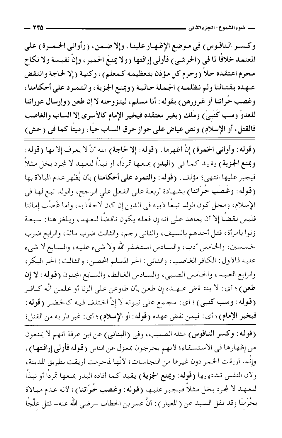 (قوله: وكسر الناقوس) مثله الصليب، وفي (البناني) عن ابن عرفة أنهم لا يمنعون من إظهارها في الاستقساء؛ لأنهم يخرجون بمعزل عن الناس (قوله فأولى إراقتها)، وإنما أريقت الخمر دون غيرها نم النجاسات؛ لأنها لما حرمت أريقت بطريق المدينة، ولأن النفس تشتهيها (قوله: ويمنع الجزية) يقيد كما أفاده البدر بمنعها تمردًا أو نبذًا للعهد لا لمجرد بخل مثلاً فيجبر عليها (قوله: وغصب حراتنا)؛ لأن عدم مبالاة بحرمنا وقد نقل السيد عن (المعيار): أن عمر بن الخطاب _رضي الله عنه- قتل علجًا
