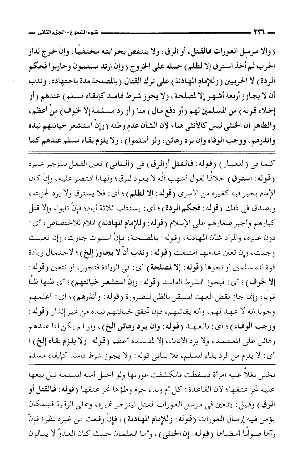 كما في (المعيار) قوله: فالقتل أو الرق) في (البناني) تعين الفعل لينزجر غيره (قوله: استرق) خلافًا لقول أشهب أنه لا يعود للرق؛ ولهذا اقتصر عليه؛ وإن كان الإمام يخير فيه كغيره من الأسرى (قوله: إلا لظلم)؛ أي: فلا يسترق ولا يرد لجزيته، ويصدق في ذلك (قوله: فحكم الردة)؛ أي: يستتاب ثلاثة أيام: فإن تابوا، وإلا قتل كبارهم وأجبر صغارهم على الإسلام (قوله: وللإمام المهادنة) اللام للاختصاص، أي: دون غيره، والمراد شأن المهادنة، وقوله: بالمصلحة، فإن استوت جازت، وإن تعينت وجبت، وإن تعين عدمها امتنعت (قوله: وندب أن لا يجاوز الخ)؛ لاحتمال زيادة قوة للمسلمين أو نحوها 0 قوله: إلا لمصلحة) أي: في الزيادة نتجوز، أو تتعين (قوله: إلا لخوف)؛ أي فيجوز الشرط الفاسد (قوله: وإن استشعر خيانتهم)؛ أي ظنها ظنً قويًا، وإنما جاز نقض العهد المتيقن بالظن للضرورة (قوله: وأنذرهم)؛ أي: أعلمهم وجوبًا أنه لا عهد لهم، وأنه يقاتلهم، فإن تحقق خيانتهم نبذة من غير إنذار (قوله: ووجب الوفاء)؛ أي: بالعهد (قوله: وإن برد رهائن الخ)، ولو لم يكن لنا عندهم رهائن على المعتمد، ولا يرد الإناث، إلا لمفسدة أعظم (قوله: ولا يلزم بقاء الخ)؛ أي: لا يلزم من الرد بقاء المسلم، فلا ينافي قوله: ولا يجوز شرط فاسد كإبقاء مسلم