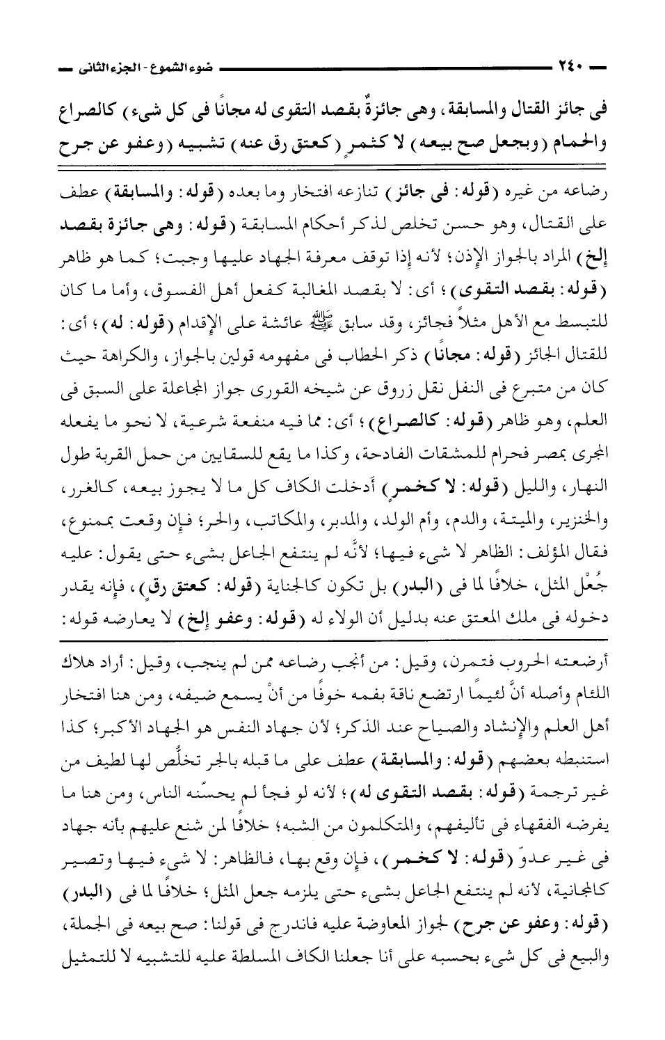 أرضعته الحروب فتمرن، وقيل: من أنجب رضاعة ممن لم ينجب، وقيل: أراد هلاك اللئام وأصله أن لئيمًا أرتضع ناقة بفمه خوفًا من أن يسمع ضيفه، ومن هنا افتخار أهل العلم والإنشاد والصياح عند الذكر؛ لأن جهاد النفس هو الجهاد الأكبر؛ كذا استنبطه بعضهم (قوله: والمسابقة) عطف على ما قبله بالجر تخلص لها لطيف من غير ترجمة (قوله: بقصد التقوي له)؛ لأنه لو فجأ لم يسحنه الناس، ومن هنا ما يفرضه الفقهاء في تاليفهم، والمتكلمون من الشبه؛ خلافًا لمن شنع عليهم بأنه جهاد في غير عدو (قوله: لا كخمر)، فإن وقع بها، فالظاهر، لا شيء فيها وتصير كالمجانية، لأنه لم ينتفع الجاعل بشيء حتى يلزمه جعل المثل؛ خلافًا لما في (البدر) (قوله: وعفو عن جرح) لجواز المعاوضة عليه فاندرج في قولنا: صح بيعه في الجملة، والبيع في كل شيء بحسبه على أنا جعلنا الكاف المسلطة عليه للتشبيه لا للتمثيل