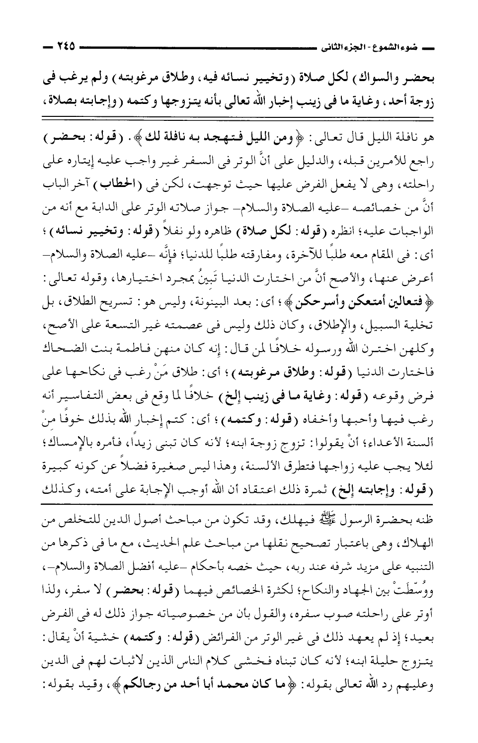 هو نافلة الليل قال تعالى: {ومن الليل فتهجد به نافلة لك}، (قوله: بحضر) راجع للأمرين قبله، والدليل على أن الوتر في السفر غير واجب عليه إيتاره على راحلته، وهي لا يفعل الفرض عليها حيث توجهت، لكن في (الخطاب) آخر الباب أن من خصائصه - عليه الصلاة والسلام- جواز صلاته الوتر على الدابة مع أنه من الواجبات عليه؛ أنظره (قوله: لكل صلاة) ظاهرة ولو نفلاً (قوله: وتخيير نسائه)؛ أي: في المقام معه طلبًا للآخرة، ومفارقته طلبًا للدنيا؛ فإنه - عليه الصلاة والسلام- أعرض عنها، والأصح أن من اختارت الدنيا تبين بمجرد اختيارهن، وقوله تعالى: {فتعالين أمتعن وأسرحكن}؛ أي: بعد البينونة، وليس هو: تسريح الطلاق، بل تخليه السبيل، والإطلاق، وكان ذالك وليس في عصمته غير التسعة على الأصح، وكلهن اخترن الله ورسوله خلافًا لمن قال: إنه كان منهن فاطمة بنت الضحاك فاختارت الدنيا (قوله: وطلاق مرغوبته)؛ أي: طلاق من رغب في نكاحها على فرض وقوعه (قوله: وغاية ما في زينب الخ) خلافًا لما وقع في بعض التفاسير أنه رغب فيها وأحبها وأخفاه (قوله: وكتمه)؛ أي: كتم إخبار الله بذلك خوفًا من ألسنة الأعداء؛ أن يقولوا: تزوج زوجه ابنه؛ لأنه كان تبني زيدًا، فأمره بالإمساك؛ لئلا يجب عليه زواجها فتطرق الألسنة، وهذا ليس صغيرة فضلاً عن كونه كبيرة (قوله: وإجابته الخ) ثمرة ذلك اعتقاد أن الله أوجب الإجابة على أمته، وكذلك