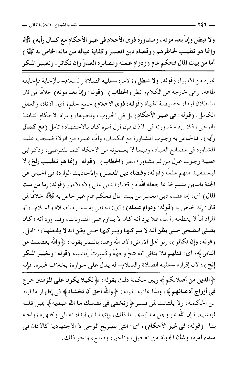 غيره من الأنبياء (قوله: ولا تبطل)؛ لأمره - عليه الصلاة والسلام - بالإجابة فإجابته طاعة، وهي خارجة عن الكلام، أنظر (الحطاب) (قوله: وإن بعد موته) خلافًا لمن قال بالبطلان لبقاء خصيصة الحياة (قوله: ذوي الأحلام) جمع حلم؛ أي: الأناة، والعقل الكامل (قوله: في غير الأحكام) بل في الحروب، ونحوها، والمراد الأحكام الثابتة بالوحي، فلا يرد مشاورته في الأذان فإن أول أمره كان بالاجتهاد؛ تأمل (مع كمال رأيه)، فالخاص به وجوب المشاورة مع الكمال، وأما غيره من الولاة فيجب عليه المشاورة في مصالح العباد، وفيما لا يعلمونه من الأحكام كما للقرطبي، وذكر ابن عطية وجوب عزل من لم يشاور؛ أنظر (الحطاب)، (قوله وإنما هو تطييب الخ) لا ليستفيد منهم علمًا (قوله: وقضاء دين المعسر) والأحاديث الواردة في الحبس عن الجنة بالدين منسوخة بما جعله الله من قضاء الدين على ولاة الأمور (قوله: إما من بيت المال) أي: إما قضاء دين المعسر من بيت المال فحكم عام عبر غبر خاص به (صلى الله عليه وسلم) خلافًا لمن قال: إنه خاص به 0 قوله: ودوام عمله)؛ أي: الخاص به - عليه الصلاة والسلام-، أو المراد أن لا يقطع رأسًا، فلا يرد أنه كان لا يداوم على المندوبات، وقد ورد أنه "كان يصلى الضحي حتى يظن أنه لا يتركها ويتركها حتى يظن أنه لا يفعلها"؛ تأمل. (قوله: وإن تكاثر)، ولو أهل الأرض؛ لأن الله وعده بالنصر بقوله: {والله يعصمك من الناس}، أي: قلتهم فلا ينافي أنه شج وجهه وكسرت رباعيته (قوله: وتغيير المنكر الخ)؛ لأن إقراره - عليه الصلاة والسلام- له يدل على جرازه؛ بخلاف غيره، فإنه