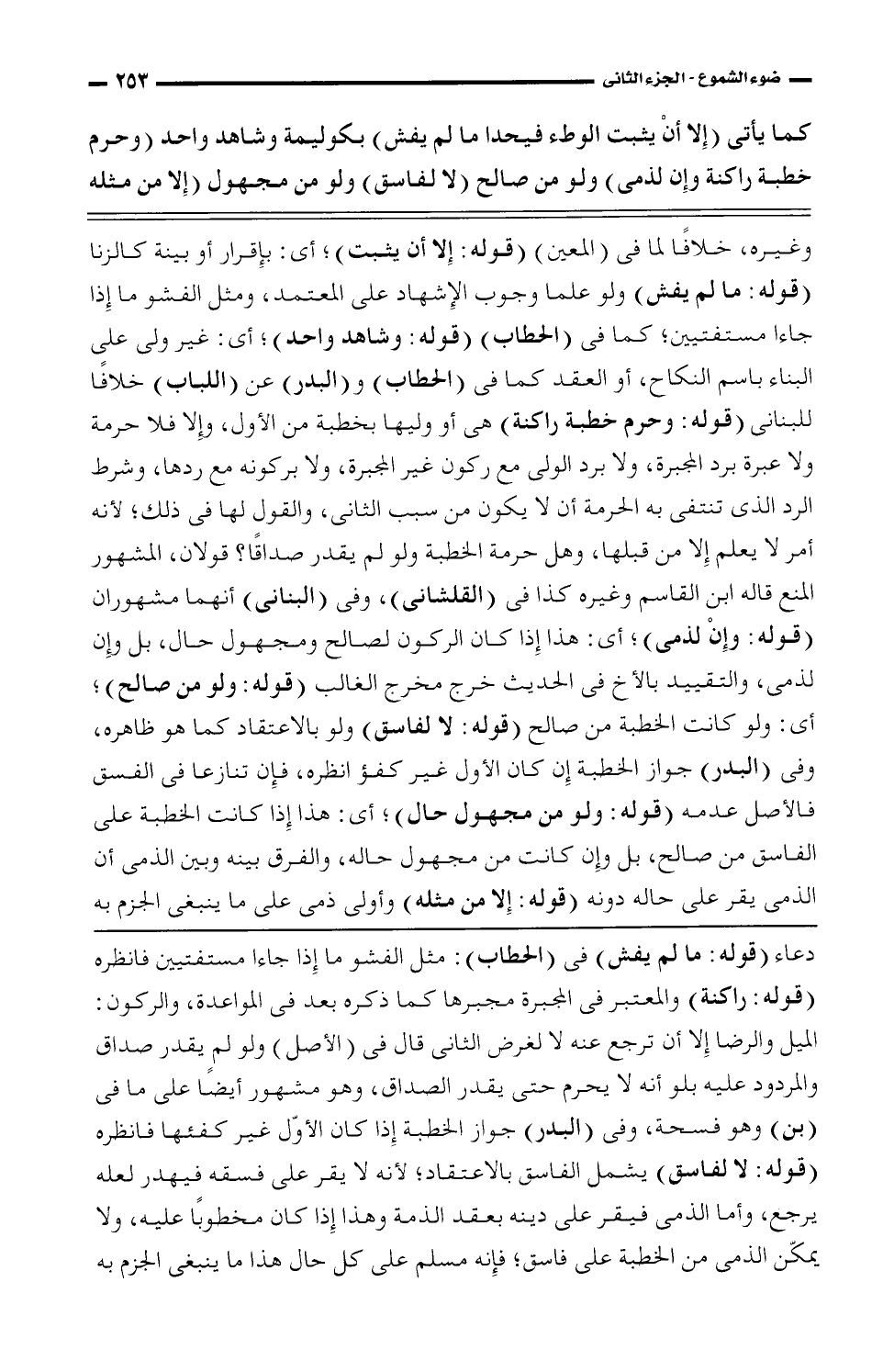 وغيره، خلافًا لما في (المعين) (قوله: إلا أن يثبت)؛ أي: بإقرار أو بينة كالزنا (قوله: ما لم يفش) ولو علما وجوب الإشهاد على المعتمد، ومثل الفشو ما إذا جاء مستفتيين؛ كما في (الحطاب) (قوله: وشاهد واحد)؛ أي: غير ولي على البناء باسم النكاح، أو العقد كما في (الحطاب) و (البدر) عن (اللباب) خلافًا للبناني (قوله: وحرم خطبة راكنة) هي أو وليها بخطبة من الأول، وإلا فلا حرمة ولا عبرة برد المجبرة، ولا برد الولي مع ركون غير المجبرة، ولا بركونه مع ردها، وشرط الرد الذي تنتفي به الحرمة أن لا يكون من سبب الثاني، والقول لها في ذلك؛ لأنه أمر لا يعلم إلا من قبلها، وهل حرمة الخطبة ولو لم يقدر صداقًا؟ قولان، المشهور المنع قاله ابن القاسم وغيره كذا في (القلشاني)، وفي (البناني) أنهما مشهوران (قوله: وإن لذمي)؛ أي: هذا إذا كان الركون لصالح ومجهول حال؛ بل وإن لذمي، التقييد بالأخ في الحديث خرج مخرج الغالب (قوله: ولو من صالح)؛ أي: ولو كانت الخطبة من صالح (قوله: لا لفاسق) ولو بالاعتقاد كما هو ظاهره، وفي (البدر) جوازا لخطبة إن كان الأول غير كفؤ انظره، فإن تنازعا في الفسق فالأصل عدمه (قوله: ولو من مجهول حال)؛ أي: هذا إذا كانت الخطبة على الفاسق من صالح، بل وإن كانت مجهول حاله، والفرق بينه وبين الذمي أن الذمي يقر على حاله دونه (قوله: إلا من مثله) وأولى ذمي على ما ينبغي الجزم به