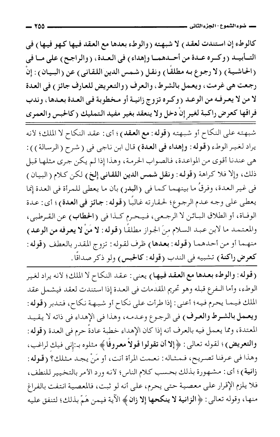 (قوله: والوطء بعدها مع القد فيها) يعنيك عقد النكاح لا الملك؛ لأنه يراد لغير الوطء، وأما الفرع قبله وهو تحريم المقدمات في العدة إذا استندت لعقد فيشمل عقد الملك فيما يحرم فيه؛ أعني: إذا طرأت على نكاح أو شبهة نكاح، فتدبر (قوله: ويعمل بالشرط والعرف) في الرجوع وعدمه، وهذا في الإهداء في ذاته لا يقيد المعتدة، ومما يعمل فيه بالعرف أنه إذا كان الإهداء خطبة عادة حرم في العدة (قوله: والتعريض)؛ لقوله تعالى: {إلا أن تقولوا قولاً معروفًا} مثلوه بـ إني فيك لراغب، وهذا في عرفنا تصريح، فمثاله: نعمت المرأة أنت، أو من يجد مثلك؟ (قوله: زانية)؛ أي: مشهورة بذلك بحسب كلام الناس، لأنه ورد الأمر بالتخيير للنطف، فلا يلزم الإقرار على معصية حتى يحرم، على أنه لو ثبت، فالمعصية انتفت بالفراغ منها، وقوله تعالى: {الزانية لا ينكحها إلى زان} الآية فمين هم بذلك؛ لتنفق عليه