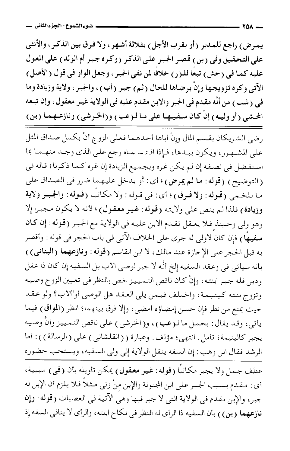 رضي الشريكان بقسم المال وإن أباها أحدهما فعلى الزوج أن يكمل صداق المثل على المشهور، ويكون بيدها، فإذا اقتسماه رجع على الذي وجد منهما بما استفضل في نصفه إن لم يكن غره وبجميع الزيادة إن غره كما ذكرنا؛ قاله في (التوضيح) (قوله: ما لم يمرض)؛ أي: أو يدخل عليهما ضرر في الصداق على ما للخمي (قوله: ولا فرق)؛ أي: في قوله: ولا مكاتبًا (قوله: والجبر ولاية وزيادة) فلذا لم ينص على ولايته (قوله: غير معقول)؛ لأنه لا يكون مجبرًا إلا وهو ولى وحينذ فلا يعقل تقدم الابن عليه في الولاية مع الجير (قوله: إن كان سفيهًا) فإن كان لأولى له جرى على الخلاف الآتي في باب الحجر في قوله: وأقصر به قبل الحجر على الإجازة عند مالك، لا ابن القاسم (قوله: ونازعهما (البناني) بأنه سيأتي في وعقد السفيه الخأنه لا جبر لوصى الأب بل السفيه إن كان ذا عقل ودين فله جبر ابنته، وإن كان ناقص التمييز خص بالنظر في تعيين الزوج وصية وتزوج بنته كيتيمة، واختلف فيمن يلي العقد هل الوصي أو الأب؟ ولو عقد حيث يمنع من نظر فإن حسن إمضاؤه أمضي، ولا فرق بينهما؛ أنظر (المواق) فيما يأتي، وقد يقال: يحمل ما لـ (عب)، و (الخشي) على ناقص التمييز وأن وصيه يجبر كاليتيمة؛ تأمل. انتهى؛ مؤلف، وعبارة (القلشاني) على (الرسالة): أما الرشد فقال ابن وهب: إن السفه ينقل الولاية إلى ولي السفيه، ويستحب