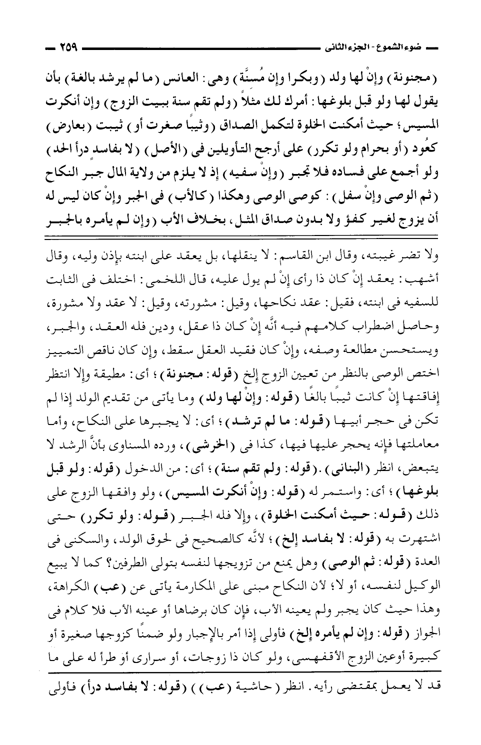 (مجنونة) وإنها لها ولد (وبكرا وإن مسنة) وهي: العانس (ما لم يرشد بالغة) بأن يقول لها ولو قبل بلوغها: أمرك لك مثلاً (ولم تقم سنة ببيت الزوج) وإن أنكرت المسيس؛ حيث أمكنت الخولة لتكمل الصداق (وثيبًا صغرت أو) ثيبت بعارض) كعود (أو بحرام ولو تكرر) على أرجح التأويلين في (الأصل) (لا بفاسد درأ الحد) ولو أجمع على فاسدة فلا تجبر (وإن سفيه) إذ لا يلزم من ولاية المال جبر النكاح (ثم الوصي وإن سفل): كوصي الوصي وهكذا (كالأب) في الجبر وإن كان ليس له أن يزوج لغير كفؤ ولا بدون صداق المثل، بخلاف الأب (وإن لم يأمره بالجبر