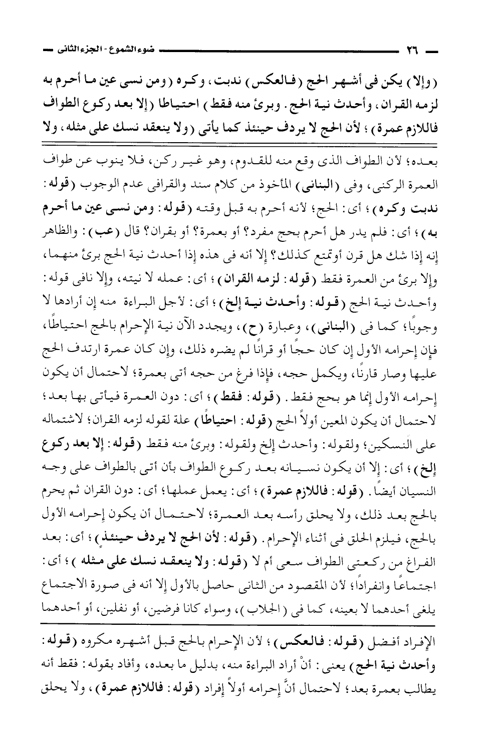 بعده؛ لأن الطواف الذى وقع منه للقدوم، وهو غير ركن، فلا ينوب عن طواف العمرة الركنى. وفى (البنانى) المأخوذ من كلام سند والقرافى عدم الوجوب (قوله: ندبت وكره)؛ أى: الحج؛ لأنه أحرم به قبل وقته (قوله: ومن نسى عين ما أحرم به)؛ أى: فلم يدر هل أحرم بحج مفرد؟ أو بعمرة؟ أو بقران؟ قال (عب): والظاهر إنه إذا شك هل قرن أو تمتع كذلك؟ إلا أنه فى هذه إذا أحدث نية الحج برئ منهما، وإلا رئ من العمرة فقط (قوله: لزمه القران)؛ أى: عمله لا نيته، وإلا نافى قوله: وأحدث نية الحج (قوله: وأحدث نية إلخ)؛ أى: لأجل البراءة منه إن أرادها لا وجوبًا؛ كما فى (البنانى)، وعبارة (ح)، ويجدد الآن نية الإحرام بالحج احتياطًا، فإن إحرامه الأول إن كان حجًا أو قرانًا لم يضره ذلك, وإن كان عمرة ارتدف الحج عليها وصار قارنًا، ويكمل حجه، فإذا فرغ من حجه أتى بعمرة؛ لاحتمال أن يكون إحرامه الأول إنما هو بحج فقط. (قوله: فقط)؛ أى: دون العمرة فيأتى بها بعد؛ لاحتمال أن يكون المعين أولاً الحج (قوله: احتياطًا) علة لقوله لزمه القران؛ لاشتماله على النسكين؛ ولقوله: وأحدث إلخ ولقوله: وبرئ منه فقط (قوله: إلا بعد ركوع إلخ)؛ إلا أن يكون نسيانه بعد ركوع الطواف بان أتى بالطواف على وجه النسيان أيضاً. (قوله: فاللازم عمرة)؛ أى: يعمل عملها؛ أى: دون القران ثم يحرم بالحج بعد ذلك، ولا يحلق رأسه بعد العمرة؛ لاحتمال أن يكون إحرامه الأول بالحج، فيلزم الحلق فى أثناء الإحرام. (قوله: لأن الحج لا يردف حينئذٍ)؛ أى: بعد الفراغ من ركعتى الطواف سعى أم لا (قوله: ولا ينعقد نسك على مثله)؛ أى: اجتماعًا وانفرادًا؛ لأن المقصود من الثانى حاصل بالأول إلا أنه فى صورة الاجتماع يلغى أحدهما لا بعينه، كما فى (الجلاب)، وسواء كانا فرضين، أو نفلين، أو