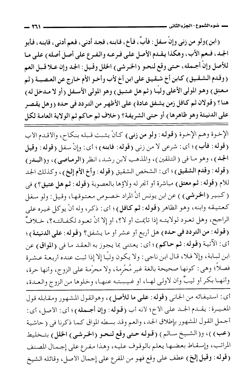 (ابن) ولو من زني وإن سفل: فأب، فأخل، فأبنه، فجد أدنى، فعم أدني، فأبنه، فأبو الجد، فعم الأب، وهكذا يقدم الأصل على فرعه والفرع على أصل أصله) على ما للأصل وإن أجمله، حتى وقع لنحو (الخرشي) الخلل وقيل: الجد وإن علا قبل العم (وقدم الشقيق) كابن أخ شقيق على ابن أخ لأب وأخو الأم خارج عن العصبة (ثم معتق) وهو المولى الأعلى وليًا (ثم هل عتيق) وهو المولى الأسفل (أو لا مدخل له) هنا؟ (قولان ثم كافل زمن يشفق عادة) على الأظهر من التردد في حدة (وهل يقصر على الدنيئة وهو ظاهرها) أو حتى الشريفة؟ (خلاف ثم حاكم ثم الولاية العامة لكل