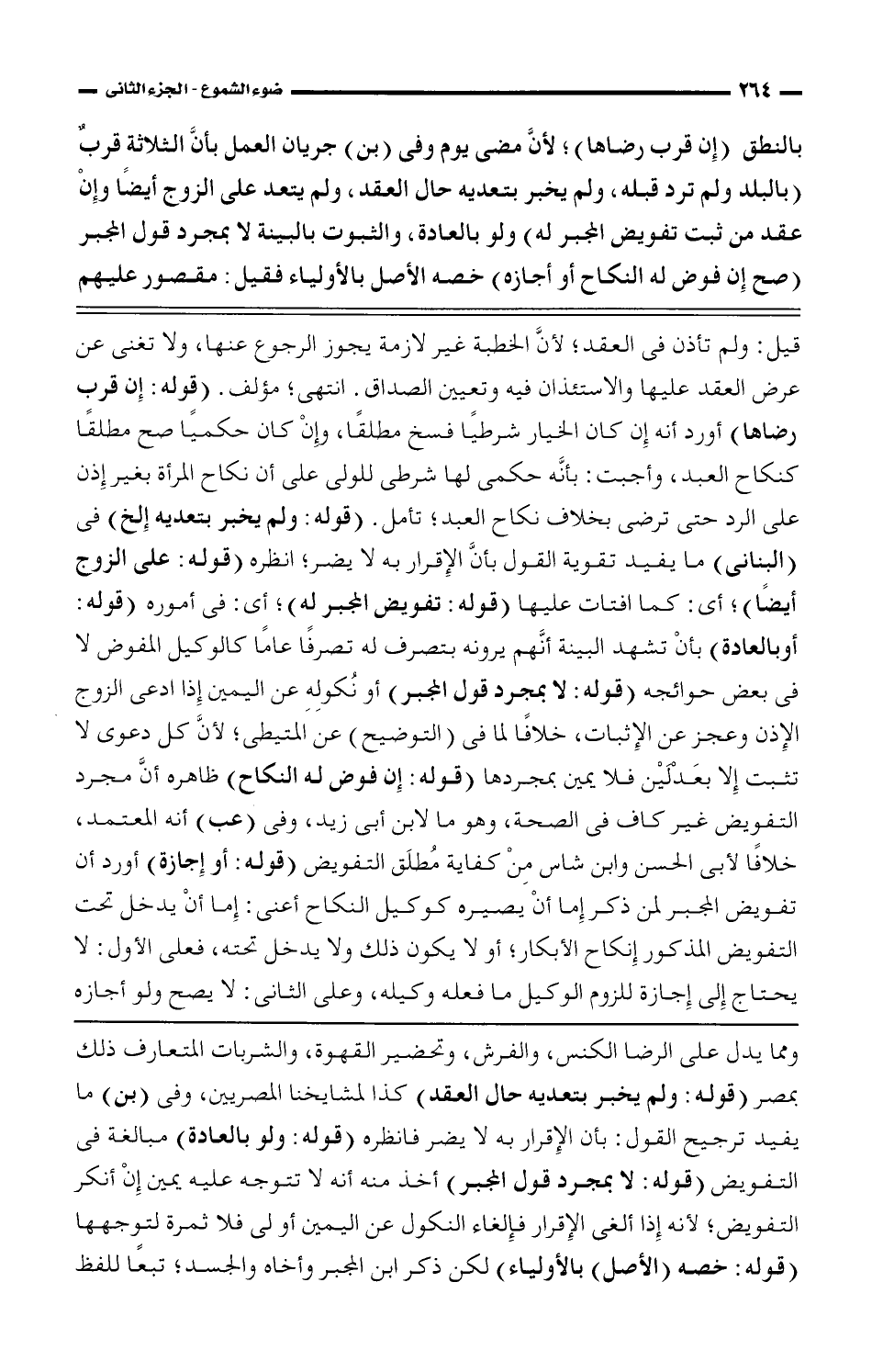 قيل: ولم تأذن في العقد؛ لأن الخطبة غير لازمة يجوز الرجوع عنها، ولا تغني عن عرض العقد عليها والاستئذان فيه وتعيين الصداق، أنتهي؛ مؤلف (قوله: إن قرب رضاها) أورد أنه إن كان الخيار شرطيًا فسخ مطلقًا، وإن كان حكميًا صح مطلقًا كنكاح العبد، وأجبت: بأنه حكمي لها شرطي للولي على أن نكاح المرأة بغير إذن على الرد حتى ترضي بخلاف نكاح العبد؛ تأمل (قوله: ولم يخبر بتعديه الخ) في (البناني) ما يفيد تقويه القول بأن الإقرار به لا يضر؛ أنظره (قوله: على الزوج أيضًا)؛ أي: كما أفتات عليها 0 قوله: تفويض المجبر له)؛ أي: في أموره (قوله: أو بالعادة) بأن تشهد البينة أنهم يرونه بتصرف له تصرفًا عامًا كالوكيل المفوض لا في بعض حوائجه 0 قوله: لا بمجرد قول المجبر) أو نكوله عن اليمين إذا أدعي الزوج الإذن وعجز عن الإثبات، خلافًا لما في (التوضيح) عن المتيطي؛ لأن كل دعوي لا تثبت إلا بعدلين فلا يمين بمجردها (قوله: إن فوض له النكاح) ظاهره أن مجرد التفويض غير كاف في الصحة، وهو ما لابن أبى زيد، وفي (عب) أنه المعتمد، خلافًا لأبي الحسن وابن شاس من كفاية مطلق التفويض (قوله: أو إجازة) أورد أن تفويض المجبر لمن ذكر إما أن يصيره كوكيل النكاح أعني: إما أن يدخل تحت التفويض المذكور أنكاح الأبكار؛ أو لا يكون ذلك ولا يدخل تحته، فعلى الأول: لا يحتاج إلى إجازة للزوم الوكيل ما فعله وكيله، وعلى الثاني: لا يصح ولو أجازه