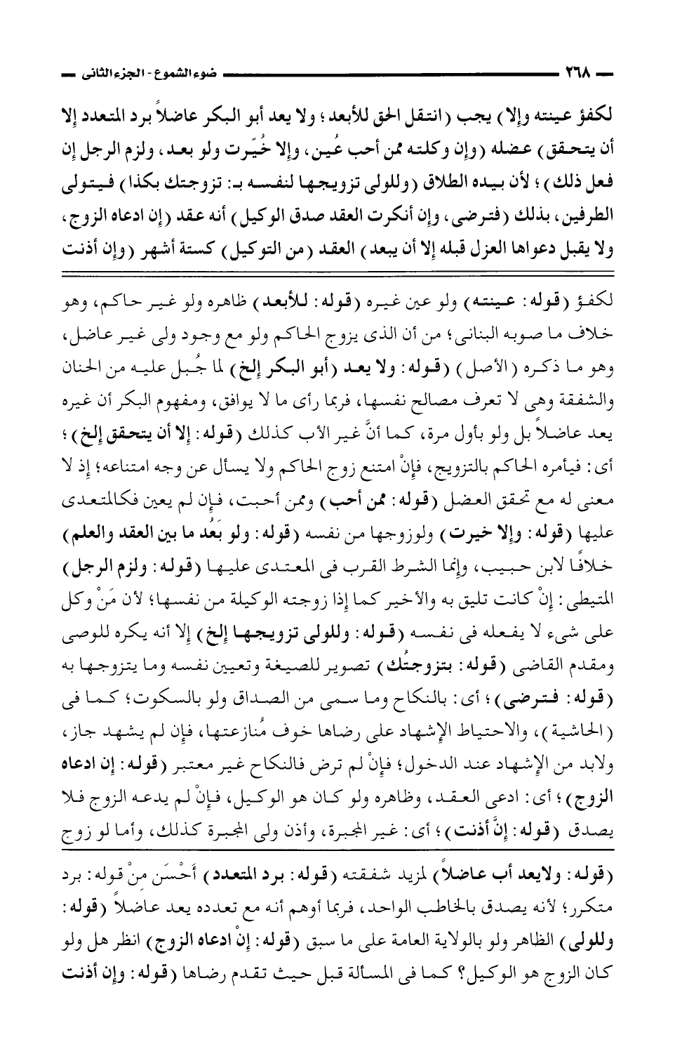 لكفؤ عينته وإلا) يجب (انتقل الحق للأبعد، ولا يعد أبو البكر عاضلاً برد المتعدد إلا يتحقق) عضله (وإن وكلته ممن أحب عين، وإلا خيرت ولو بعد، ولزم الرجل إن فعل ذلك)؛ لأن بيده الطلاق (وللولي تزويجها لنفسه بـ: تزوجتك بكذا) فيتولى الطرفين، بذلك (فترضي، وإن أنكرت العقد صدق الوكيل) أنه عقد (إن ادعاه الزوج، ولا يقبل دعواها العزل قبله إلا أن يبعد) العقد (من التوكيل) كستة أشهر (وإن أذنت