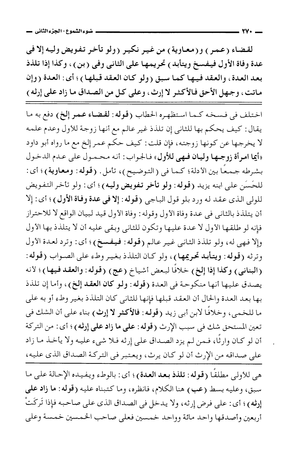 لقضاء (عمر) و (معاوية) من غير نكير (ولو تأخر تفويض وليه إلا في عدة وفاة الأول فيفسخ ويتأبد) تحريمها على الثاني وفي (بن)، وكذا إذا تلذذ بعد عدة وفاة الأول فيفسخ ويتأبد) تحريمها على الثاني وفي (بن)، وكذا إذا تلذذ بعد العدة، والعقد فيها كما سبق (ولو كان العقد قبلها)؛ أي: العدة (وإن ماتت، وجهل الأحق فالأكثر لا إرث، وعلى كل من الصداق ما زاد على إرثه)