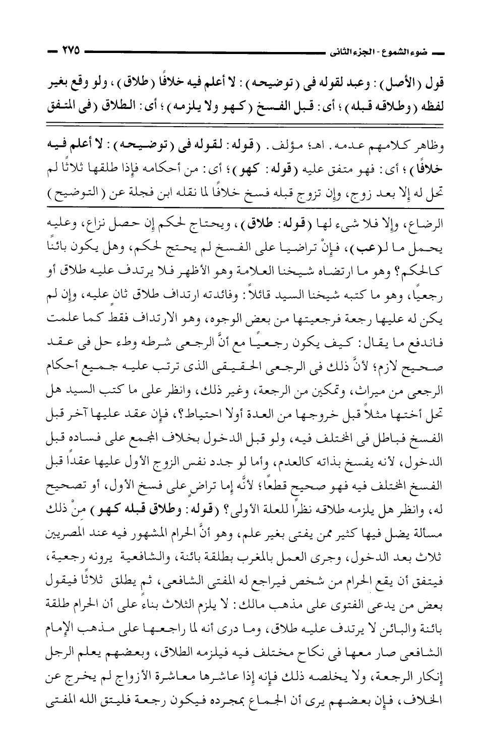 وظاهر كلامهم عدمه. اهـ مؤلف. (قوله: لقوله فى (توضيحه): لا أعلم فيه خلافًا)؛ أى: فهو متفن عليه (قوله: كهو)؛ أى: من أحكامه فإذا طلقها ثلاثًا لم تحل له إلا بعد زوج، ون تزوج قبله فسخ خلافًا لما نقله ابن فجلة عن (التوضيح)
