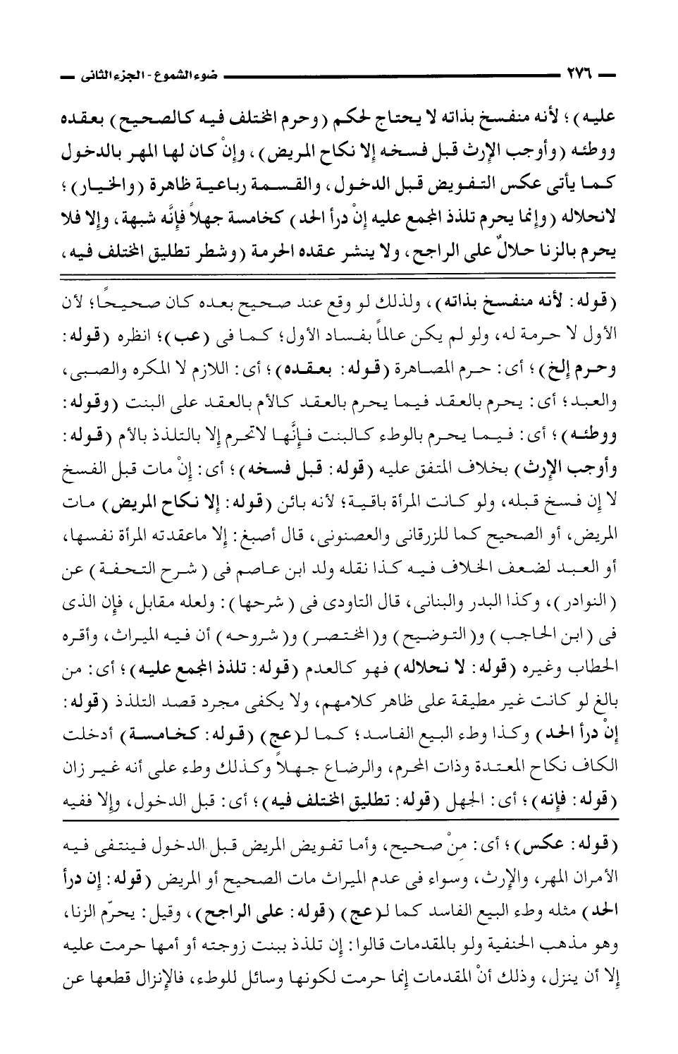 عليه)؛ لأنه منفسخ بذاته لا يحتاج لحكم (وحرم المختلف فيه كالصحيح) بعقده ووطئه (وأوجب الإرث قبل فسخه إلا نكاح المريض)، وإن كان لها المهر بالدخول كما يأتى عكس التفويض قبل الدخول، والقسمة رباعية ظاهرة (والخيار)؛ لانحلاله (وإنما يحرم تلذذ المجمع عليه إن درأ الحد) كخامسة جهلاً فإنَّه شبهة، وإلا فلا يحرم بالزنا حلال على الراجح، ولا ينشر عقده الحرمة (وشطر تطليق المختلف فيه،