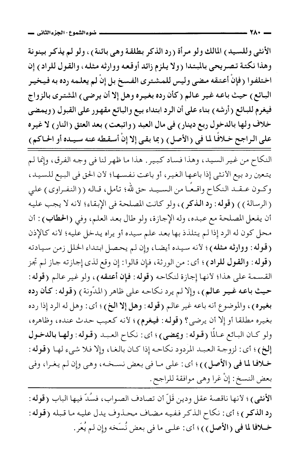 الأنثى وللسيد) المالك ولو مرأة (رد الذكر بطلقة وهى بائنة)، ولو لم يذكر بينونة وهذا نكتة تصريحى بالمبتدا (ولا يلزم زائد أوقعه ووارثه مثله، والقول للراد) إن اختلفوا (فإن أعتقه مضى وليس للمشترى الفسخ بل إن لم يعلمه رده به فيخير البائع) حيث باعه غير عالم (كأن رده بغيره وهل إلا أن يرضى) المشترى بالزواج فيغرم للبائع (أرشه) بناء على أن الرد ابتداء بيع والبائع مقهور على القبول (ويمضى خلاف ولها بالدخول ربع دينار) فى مال العبد (واتبعت) بعد العتق (النار) لا غيره على الراجح خلافًا لما فى (الأصل) (بما بقى إلا إن أسقطه عنه سيده أو الحاكم)