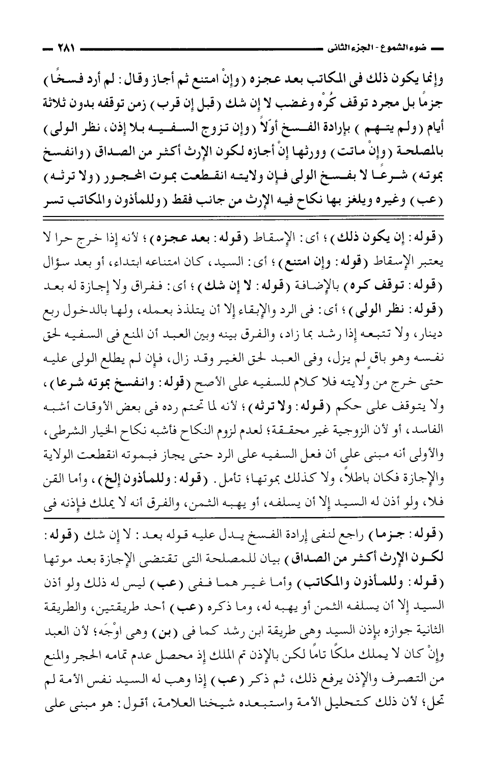 (قوله: إن يكون ذلك)؛ أى: الإسقاط (قوله: بعد عجزه)؛ لأنه إذا خرج حرا لا يعتبر الإسقاط (قوله: وإن امتنع)؛ أى: السيد، كان امتناعه ابتداء، أو بعد سؤال (قوله: توقف كره) بالإضافة (قوله: لا إن شك)؛ أى: ففراق ولا إجازة له بعد (قوله: نظر الولى)؛ أى: فى الرد والإبقاء إلا أن يتلذذ بعمله، ولها بالدخول ربع دينار، ولا تتبعه إذا رشد بما زاد، والفرق بينه وبين العبد أن المنع فى السفيه لحق نفسه وهو باقٍ لم يزل، وفى العبد لحق الغير وقد زال، فإن لم يطلع الولى عليه حتى خرج من ولأىته فلا كلام للسفيه على الأصح (قوله: وانفسخ بموته شرعا)، ولا يتوقف على حكم (قوله: ولا ترثه)؛ لأنه لما تحتم رده فى بعض الأوقات أشبه الفاسد، أو لأن الزوجية غير محققة؛ لعدم لزوم النكاح فأشبه نكاح الخيار الشرطى، والأولى أنه مبنى على أن فعل السفيه على الرد حتى يجاز فبموته انقطعت الولأىة والإجازة فكان باطلاً، ولا كذلك بموتها؛ تأمل. (قوله: وللمأذون إلخ)، وأما القن فلا، ولو أذن له السيد إلا أن يسلفه، أو يهبه الثمن، والفرق أنه لا يملك فإنه فى