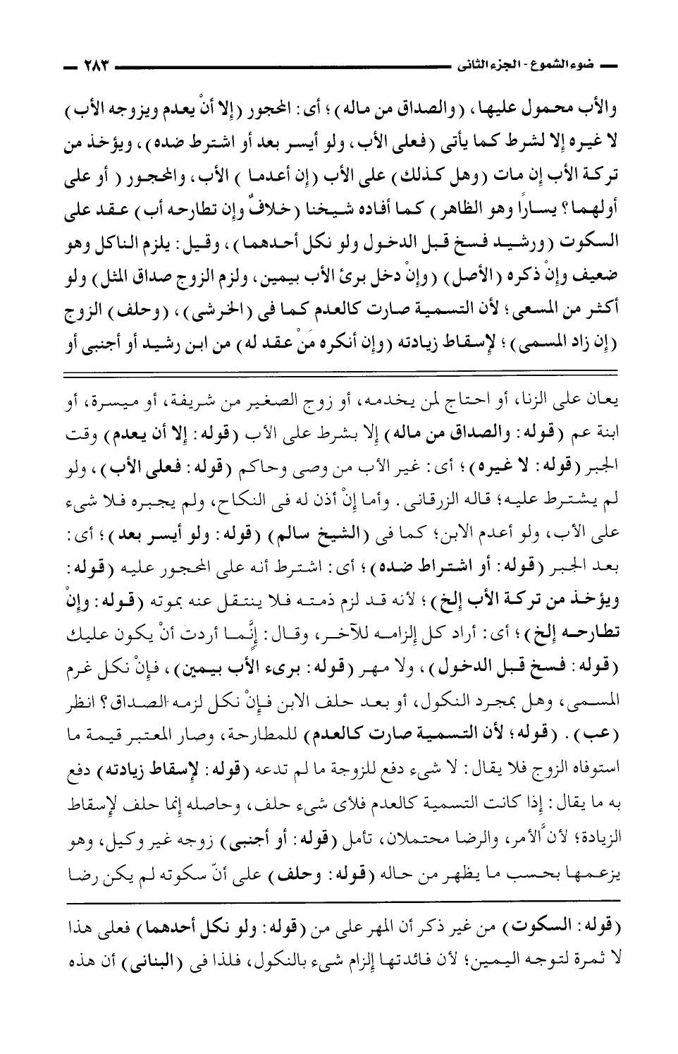 يعان على الزنا، أو احتاج لمن يخدمه، أو زوج الصغير من شريفة، أو ميسرة، أو ابنة عم (قوله: والصداق من ماله) إلا بشرط على الأب (قوله: إلا أن يعدم) وقت الجبر (قوله: لا غيره)؛ أى: غير الأب من وصى وحاكم (قوله: فعلى الأب)، ولو لم يشترط عليه؛ قاله الزرقانى. وأما إن أذن له فى النكاح، ولم يجبره فلا شئ على الأب، ولو أعدم لابن؛ كما فى (الشيخ سالم) (قوله: ولو أىسر بعد)؛ أى: بعد الجبر (قوله: أو اشتراط ضده)؛ أى: اشترط أنه على المحجور عليه (قوله: ويؤخذ من تركة الأب إلخ)؛ لأنه قد لزم ذمته فلا ينتقل عنه بموته (قوله: وإن تطارحه إلخ)؛ أى: راد كل إلزامه للآخر، وقال: إنَّما أردت أن يكون عليك (قوله: فسخ قبل الدخول)، ولا مهر (قوله: برئ الأب بيمين)، فإن نكل غرم المسمى، وهل بمجرد النكول، أو بعد حلف الأبن فإن نكل لزمه الصداق؟ انظر (عب). (قوله؛ لأن لتسمية صارت كالعدم) للمطارحة، وصار المعتبر قيمة ما استوفاه الزوج فلا يقال: لا شئ دفع للزوجة ما لم تدعه (قوله: لإسقاط زيادته) دفع به ما يقال: إذا كانت التسمية كالعدم فلأى شئ حلف، وحاصله إنما حلف لإسقاط الزيادة؛ لأنَّ الأمر، والرضا محتملان، تأمل (قوله: أو أجنبى) زوجه غير وكيل، وهو يزعمها بحسب ما يظهر من حاله (قوله: وحلف) على أنّ سكوته لم يكن رضا