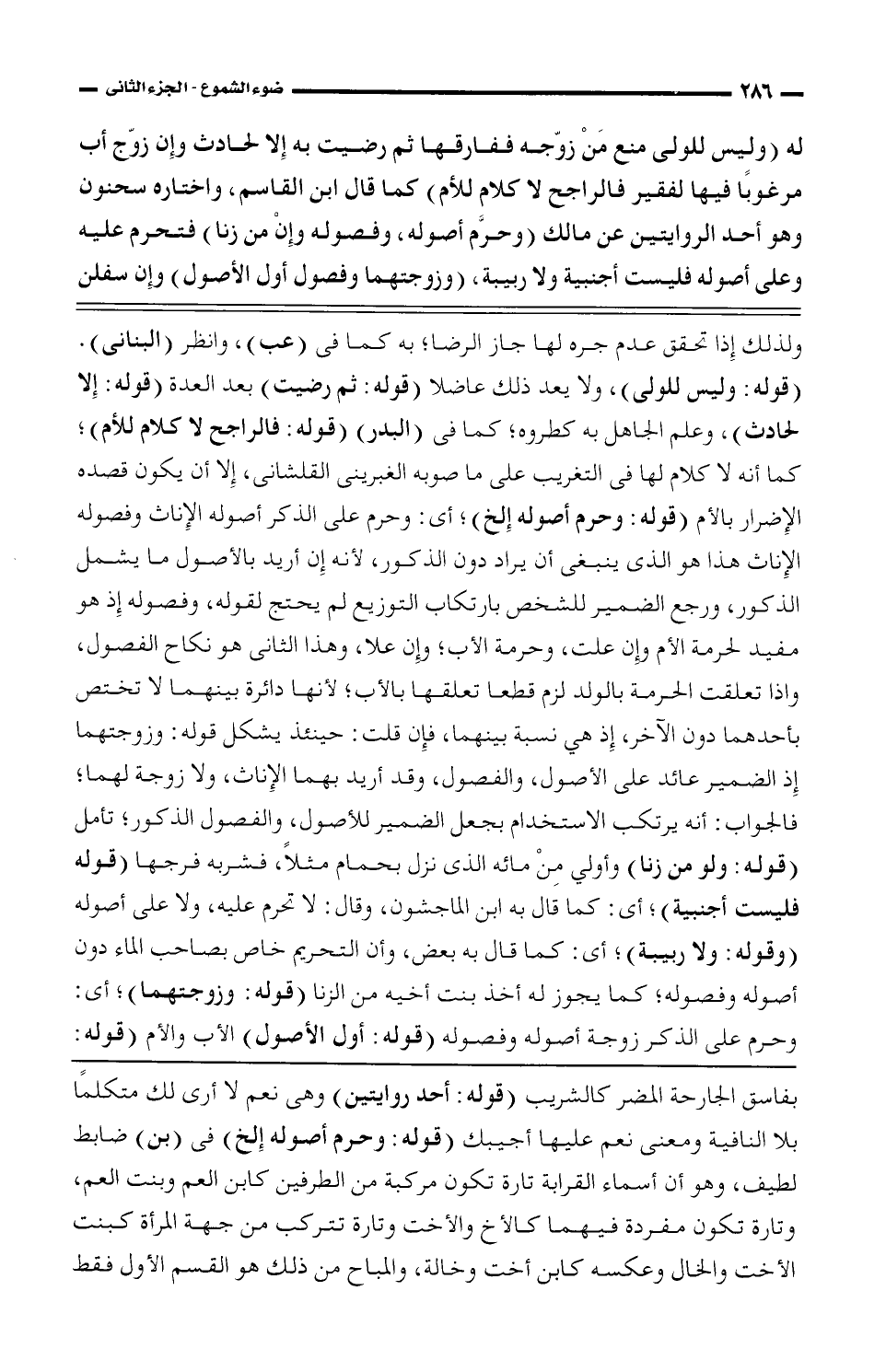 ولذلك إذا تحقق عدم جره لها جاز الرضا؛ به كما فى (عب)، وانظر (البنانى). (قوله: وليس للولى)، ولا يعد ذلك عاضلا (قوله: ثم رضيت) بعد العدة (قوله: إلا لحادث)، وعلم الجاهل به كطروه؛ كما فى (البدر) (قوله: فالراجح لا كلام للأم)؛ كما أنه لا كلام لها فى التغريب على ما صوبه الغبرينى القلشانى، إلا أن يكون قصده الإضرار بالأم (قوله: وحرم أصوله إلخ)؛ أى: وحرم على الذكر أصوله والإناث وفصوله الإناث هذا هو الذى ينبغى أن يراد دون الذكور، لأنه إن أريد بالأصول ما يشمل الذكور، ورجع الضمير للشخص بارتكاب التوزيع لم يحتج لقوله، وفصوله إذ هو مفيد لحرمة الأم وإن علت، وحرمة الأب؛ وإن علا، وهذا الثانى هو نكاح الفصول، وإذا تعلقت الحرمة بالولد لزم قطعًا تعلقها بالأب؛ لأنها دائرة بينهما لا تختص بأحدهما دون الآخر، إذ هي نسبة بينهما، فإن قلت: حينئذ يشكل قوله: وزوجتهما إذ الضمير عائد على الأصول، والفصول، وقد أريد بهما الإناث، ولا زوجة لهما؛ فالجواب: أنه يرتكب الاستخدام بجعل الضمير للأصول، والفصول الذكور؛ تأمل (قوله: ولو من زنا) وأولي من مائه الذى نزل بحمام مثلاً، فشربه فرجها (قوله فليست أجنبية)؛ أى: كما قال به بعض، وأن التحريم خاص بصاحب الماء دون أصوله وفصوله؛ كما يجوز له أخذ بنت أخيه من الزنا (قوله: وزوجتهما)؛ أى: وحرم على الذكر زوجة أصوله وفصوله (قوله: أول الأصول) الأب والأم (قوله: