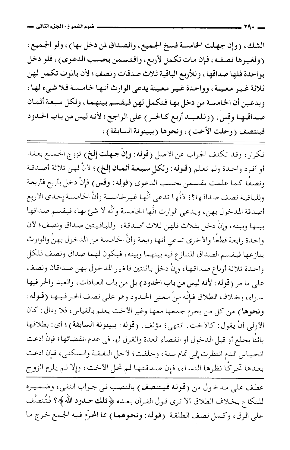 عطف على مدخول من (قوله فينتصف) بالنصب فى جواب النفى، وضميره للنكاح بخلاف الطلاق ألا ترى قول القرآن بعده {تلك حدود الله}؟ فتنصَّف على الرق، وكمل نصف الطلقة (قوله: ونحوهما) مما المحرم فيه الجمع خرج ما