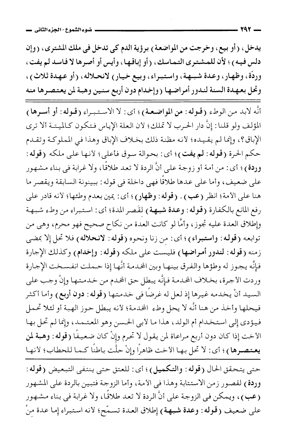 يدخل، (أو بيع، وخرجت من المواضعة) برؤية الدم كى تدخل فى ملك المشترى، (وإن دلس فيه)؛ لأن للمشترى التماسك، (أو إباقها، وأىس أو أصرها لا فاسد لم يفت، وردّة، وظهار، وعدة شبهة، واستبراء، وبيع خيار) لانحلاله، (أو عهدة ثلاث)، ونحل بعهدة السنة لندور أمراضها (وإخدام دون أربع سنين وهبة لمن يعتصرها منه