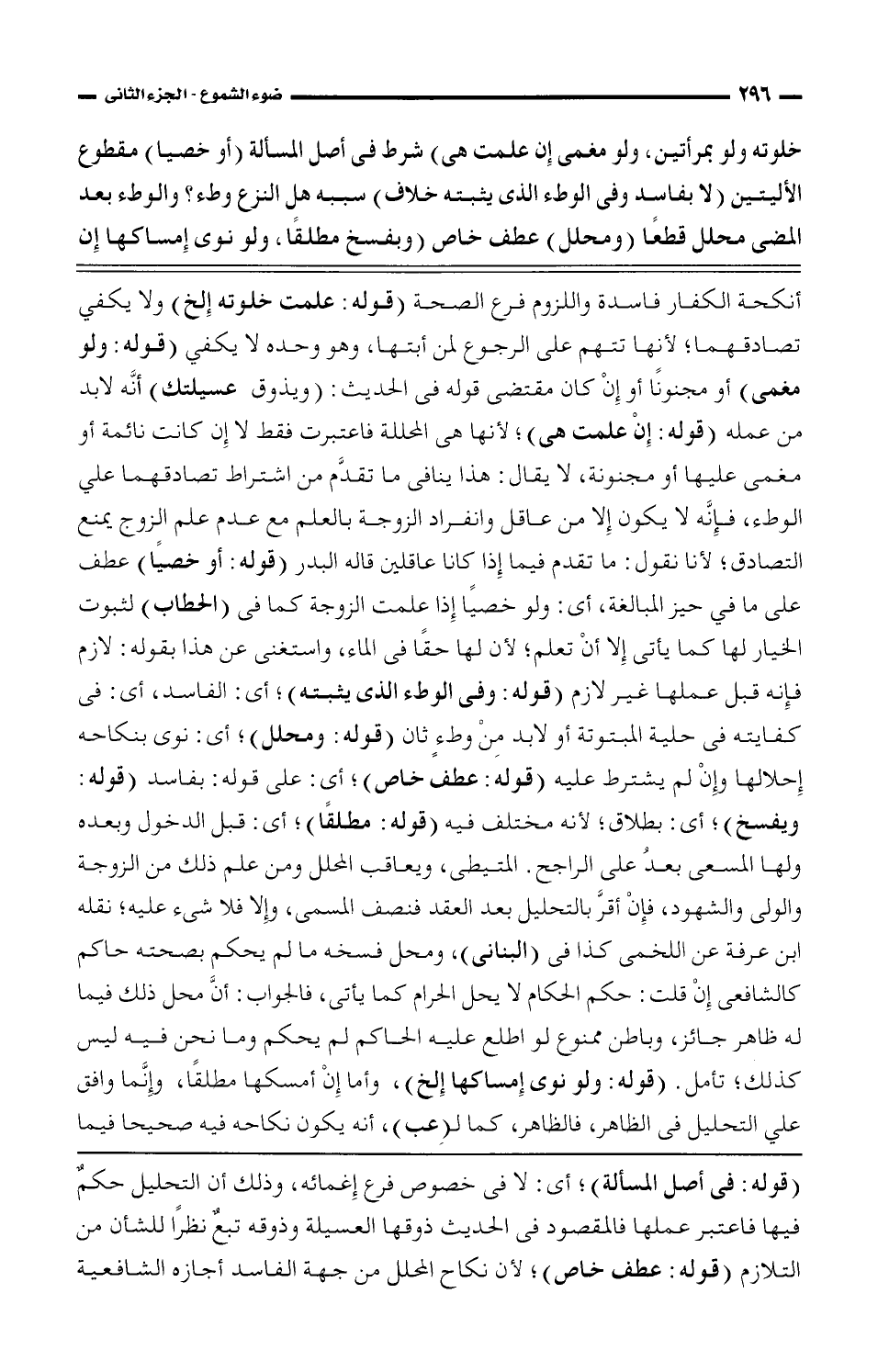 أنكحة الكفار فاسدة واللزوم فرع الصحة (قوله: علمت خلوته إلخ) ولا يكفي تصادقهما، لأنها تتهم على الرجوع لمن أبتها، وهو وحدة لا يكفي (قوله: ولو مغمى) أو مجنونًا أو إن كان مقتضى قوله فى الحديث: (ويذوق عسيلتك) أنَّه لابد من عمله (قوله: إن علمت هى)، لأنها هى المحللة فاعتبرت فقط لا إن كانت نائمة أو مغمى عليها أو مجنونة، لا يقال: هذا ينفاى ما تقدَّم من اشتراط تصادقهما علي الوطء، فإتَّه لا يكون إلا من عاقل وانفراد الزوجة بالعلم مع عدم علم الزوج يمنع التصادق، لأنا نقول: ما تقدم فيما إذا كانا عاقلين قاله البدر (قوله: أو خصيًا) عطف على ما في حيز المبالغة، أى: ولو خصيًا إذا علمت الزوجة كما فى (الحطاب) لثبوت الخيار لها كما يأتى إلا أن تعلم، لأن لها حقًا فى الماء، واستغنى عن هذا بقوله: لازم فإنه قبل عملها غير لازم (قوله: وفى الوطء الذى يثبته) أى: الفاسد، أى: فى كفأىته فى حلية المبتوتة أو لابد من وطءٍ ثان (قوله: ومحلل)، أى: نوى بنكاحه إحلالها وإن لم يشترط عليه (قوله: عطف خاص)، أى: على قوله: بفاسد (قوله: ويفسخ)، أى: بطلاق، لأنه مختلف فيه (قوله: مطلقًا)، أى: قبل الدخول وبعده ولها المسعى بعدُ على الراجح. والمتيطى، ويعاقب المحلل ومن علم ذلك من الزوجة والولى الشهود، فإن أقرَّ بالتحليل بعد العقد فنصف المسمى، وإلا فلا شئ عليه، نقله ابن عرفه عن اللخمى كذا فى (البنانى)، ومحل فسخه ما لم يحكم بصحته حاكم كالشافعى إن قلت: حكم الحكام لا يحل الحرام كما يأتى، فالجواب: أنَّ محل ذلك فيما له ظاهر جائز، وباطن ممنوع لو اطلع عليه الحاكم لم يحكم وما نحن فيه ليس كذلك، تأمل. (قوله: ولو نوى إمساكها إلخ)، وأما إن أمسكها مطلقًا، وإنَّما وافق على التحليل فى الظاهر، فالظاهر، كما ل (عب)، أنه يكون نكاحه فيه صحيحا فيما