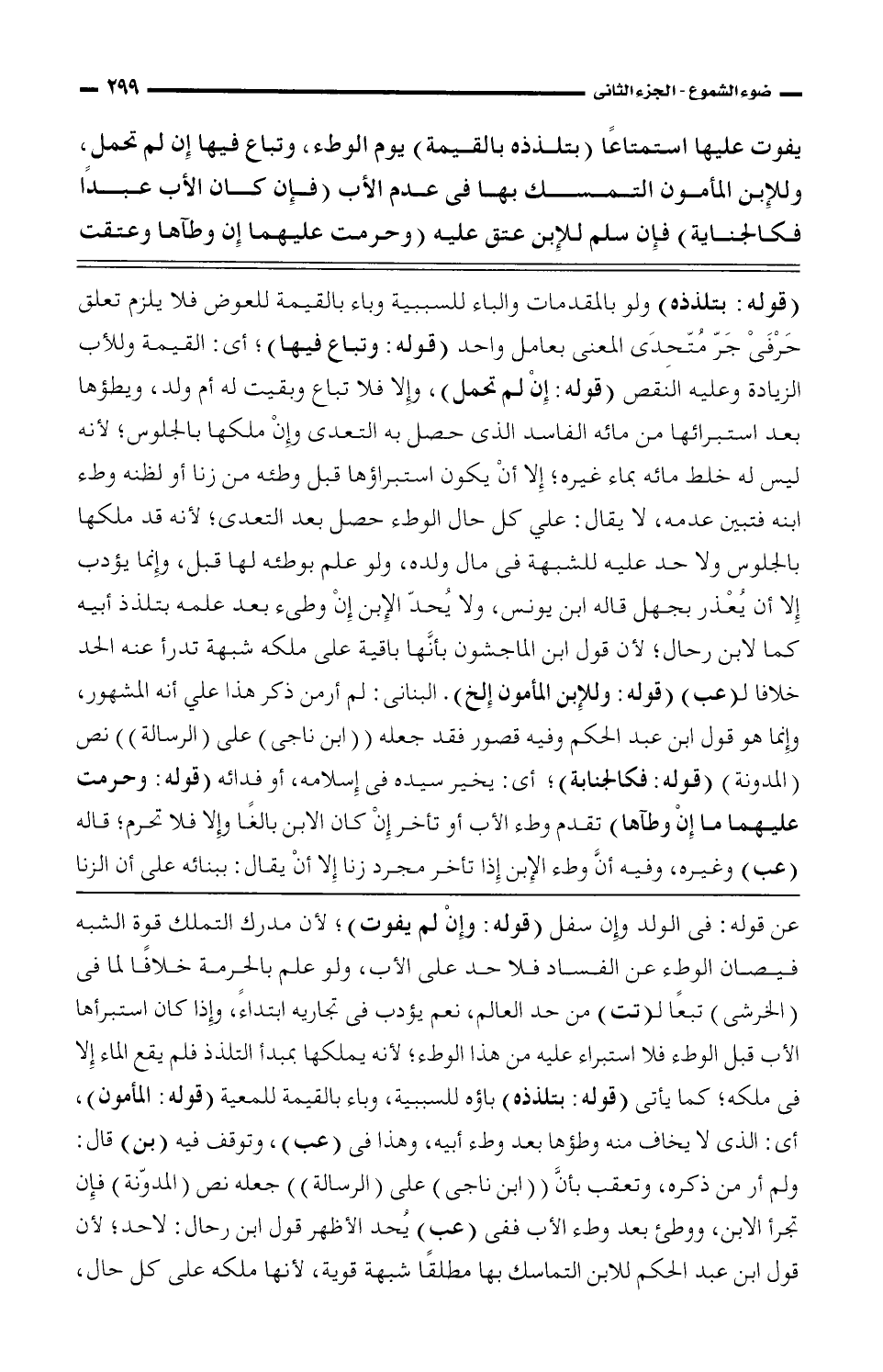 عن قوله: فى الولد وإن سفل (قوله: وإن لم يفوت)، لأن مدرك التملك قوة الشبه فيصان الوطء عن الفساد فلا حد على الأب، ولو علم بالحرمة خلافًا لما فى (الخرشى) تبعًا ل (تت) من حد العالم، نعم يؤدب فى تجاريه ابتداءً، وإذا كان استبرأها الأب قبل الوطء فلا استبراء عليه من هذا الوطء، لأنه يملكها بمبدأ التلذذ فلم يقع الماء إلا فى ملكه، كما يأتى (قوله: بتلذذه) باؤه للسببية، وباء بالقيمة للمعية (قوله: المأمون)، أى: الذى لا يخاف منه وطؤها بعد وطء أبيه، وهذا فى (عب)، وتوقف فيه (بن) قال: ولم أر من ذكره، وتعقب بأنَّ ((ابن ناجى) على الرسالة)) جعله نص (المدونة) فإن تجرأ الابن، ووطئ بعد وطء الأب ففى (عب) يُحد الأظهر قول ابن رحال: لاحد، لان قول ابن عبد الحكم للابن التماسك بها مطلقًا شبهة قوية، لأها ملكه على كل حال،