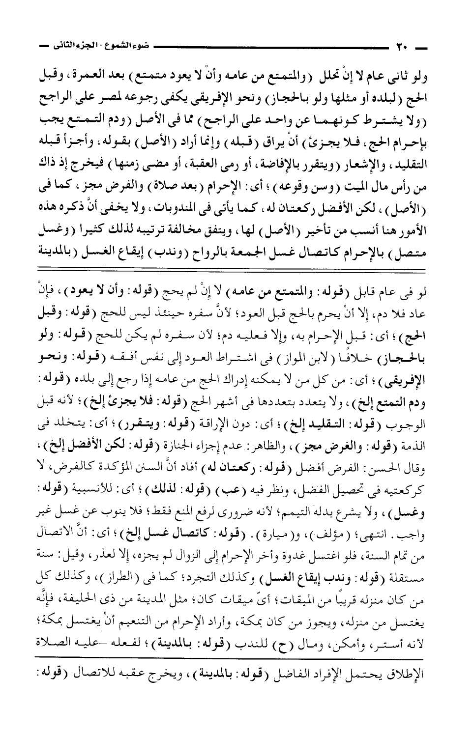 ولو ثانى عام لا إِنْ تحلل (والمتمتع من عامه وأنْ لا يعود متمتع) بعد العمرة، وقبل الحج (لبلدة أو مثلها ولو بالحجاز) ونحو الإفريقى يكفى رجوعه لمصر على الراجح (ولا يشترط كونهما عن واحد على الراجح) مما فى الأصل (ودم التمتع يجب بإحرام الحج، فلا يجزئ) أنْ يراق (قلبه) وإنما أراد (الأصل) بقوله، وأجزأ قلبه التقليد، والإشعار (ويتقرر بالإفاضة، أو رمى العقبة، أو مضى زمنها) فيخرج إذ ذاك من رأس مال الميت (وسن وقوعه)؛ أى: الإحرام (بعد صلاة) والفرض مجز، كما فى (الأصل)، لكن الأفضل ركعتان له، كما يأتى فى المندوبات، ولا يخفى أنَّ ذكره هذه الأمور هنا أنسب من تأخير (الأصل) لها، ويتفق مخلفة تربيه لذلك كثيراً (وغسل متصل) بالإحرام كاتصال غسل الجمعة بالرواح (وندب) إيقاع الغسل (بالمدينة