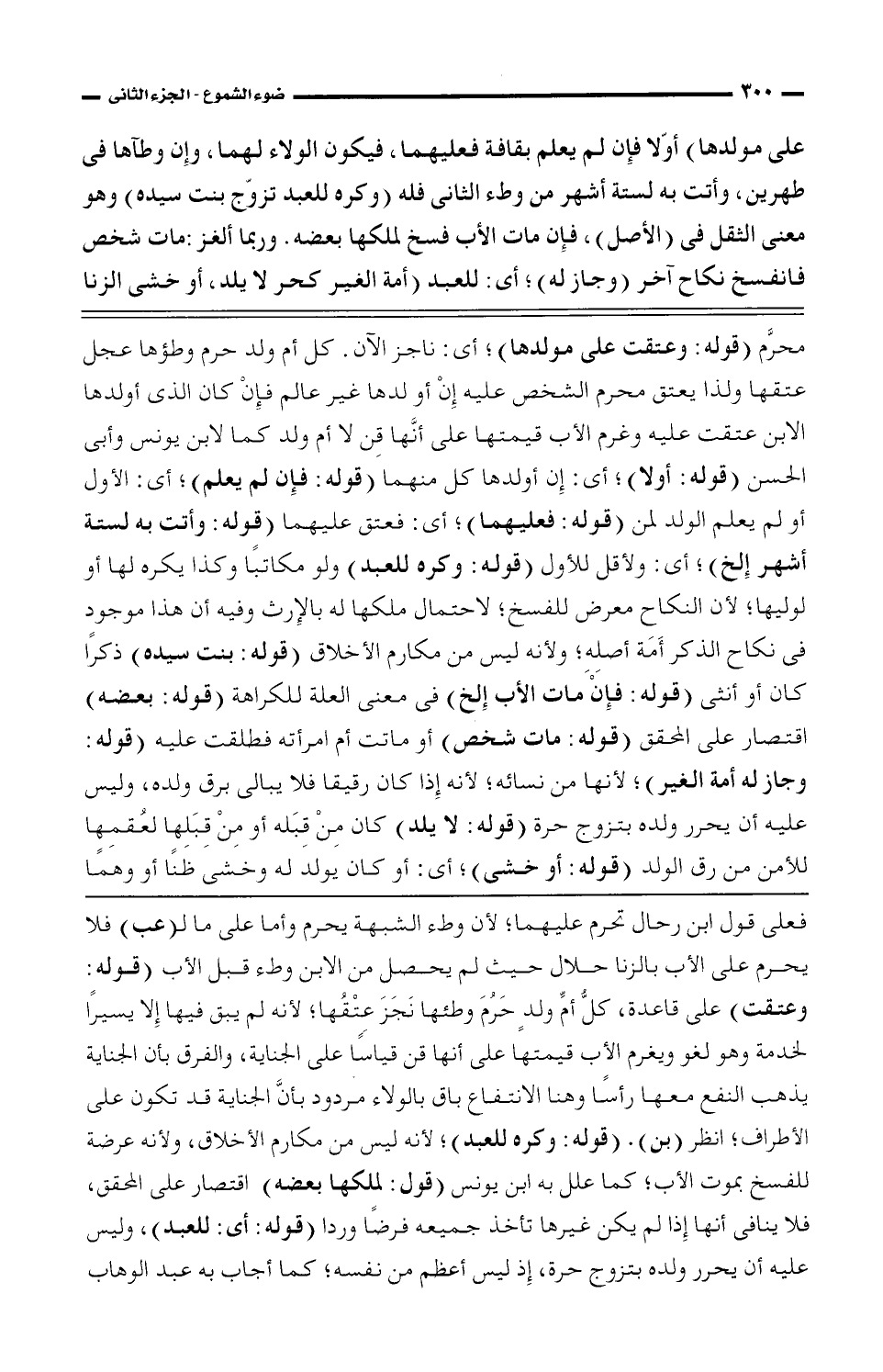 محرَّم (قوله: وعتقت على مولدها)، أى: ناجز الآن. كل أم ولد حرم وطؤها عجل عتقها وذا يعتق محرم الشخص عليه إن ولدها غير عالم فإن كان الذى أولدها الابن عتقت عليه وغرم الأب قيمتها على أنَّها قن لا أن ولد كما لابن يونس وأبى الحسن (قوله: أولا)، أى: إن أولدها كل منهما (قوله: فإن لم يعلم)، أى: الأول أو لم يعلم الولد: لمن (قوله: فعليهما)، أى: فعتق عليهما (قوله: وأتت به لستة أشهر إلخ)، أى: ولأقل لأول (قوله: وكره للعبد) ولو مكاتبًا وكذا يكره لها أو لوليها، لأن النكاح نعرض للفسخ، لاحتمال ملكها له بالإرث وفيه أن هذا موجود فى نكاح الذكر أمة أصله، ولأنه ليس من مكارم الأخلاق (قوله: بنت سيده) ذكرًا كان أو أنثى (قوله: فإن مات الأب إلخ) فى معنى العلة للكراهة (قوله: بعضه) اقتصار على المحقق (قوله: مات شخص) أو ماتت أم امراته فطلقت عليه (قوله: وجاز له أمة الغير)، لأنها من نسائه، لأنه إذا كان رقيقا فلا يبالى ولده، وليس عليه أن يحرر ولده بتزوج خرة (قوله: لا يلد) كان من قبله أو من قبَلها لعُقمها للأمن من رق الولد (قوله: أو خشى)، أى: أو كان يولد له وخشى ظنًا أو وهمًا